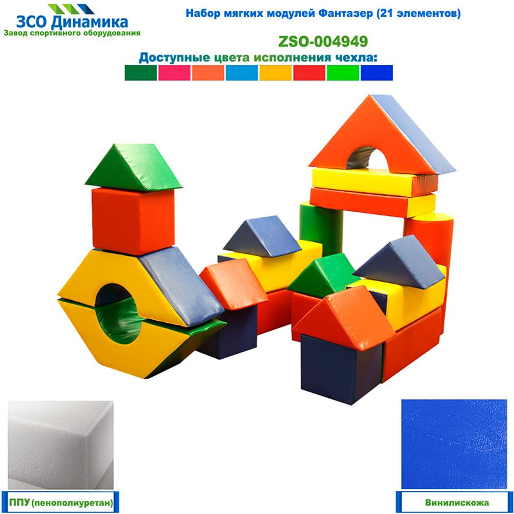 Набор мягких модулей Фантазер представляет собой комплект мягких изделий, состоящих из чехлов сшитых из винилискожи и наполнителя - прочного поролона (ППУ - пенополиуретан плотностью 19,3 кг/м3). У модулей имеется молния со скрытыми замками для замены наполнителя.