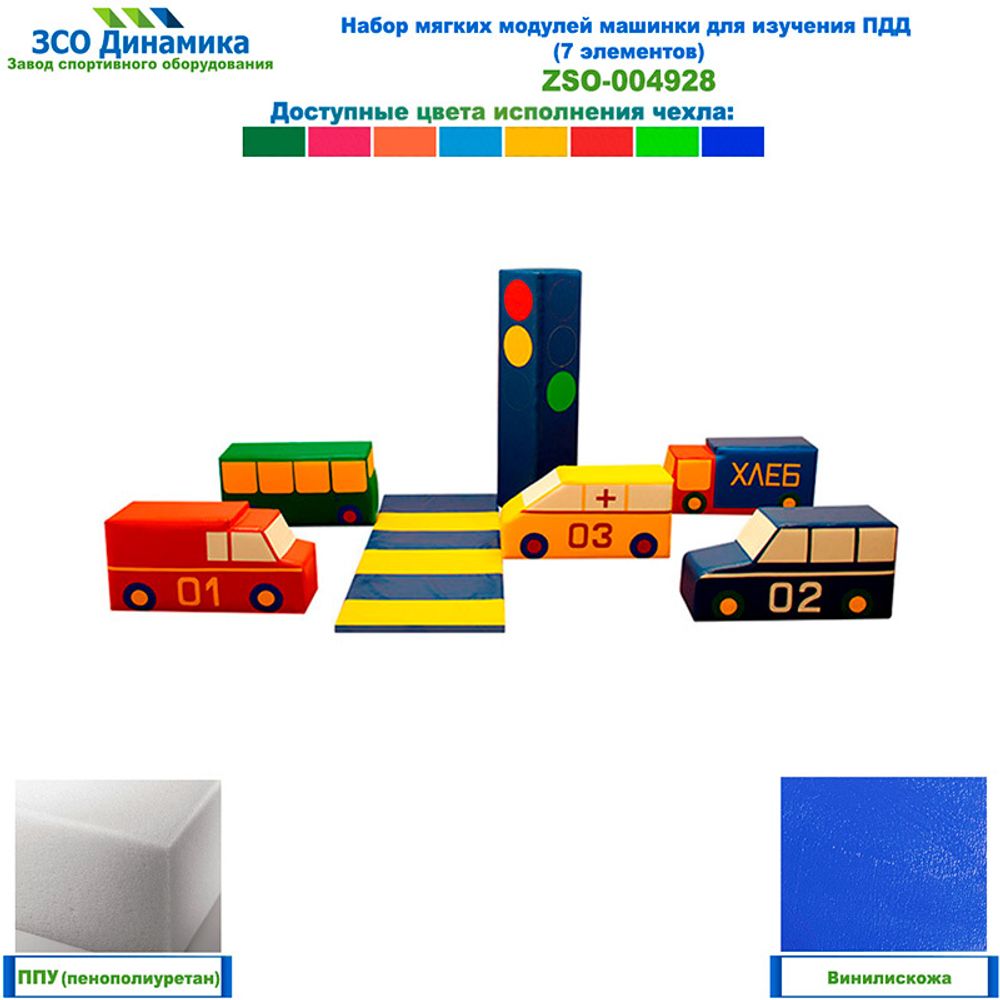 Набор мягких модулей машинки для изучения ПДД представляет собой комплект мягких изделий, состоящих из чехлов сшитых из винилискожи и наполнителя - прочного поролона (ППУ - пенополиуретан плотностью 19,3 кг/м3). У модулей имеется молния со скрытыми замками для замены наполнителя.