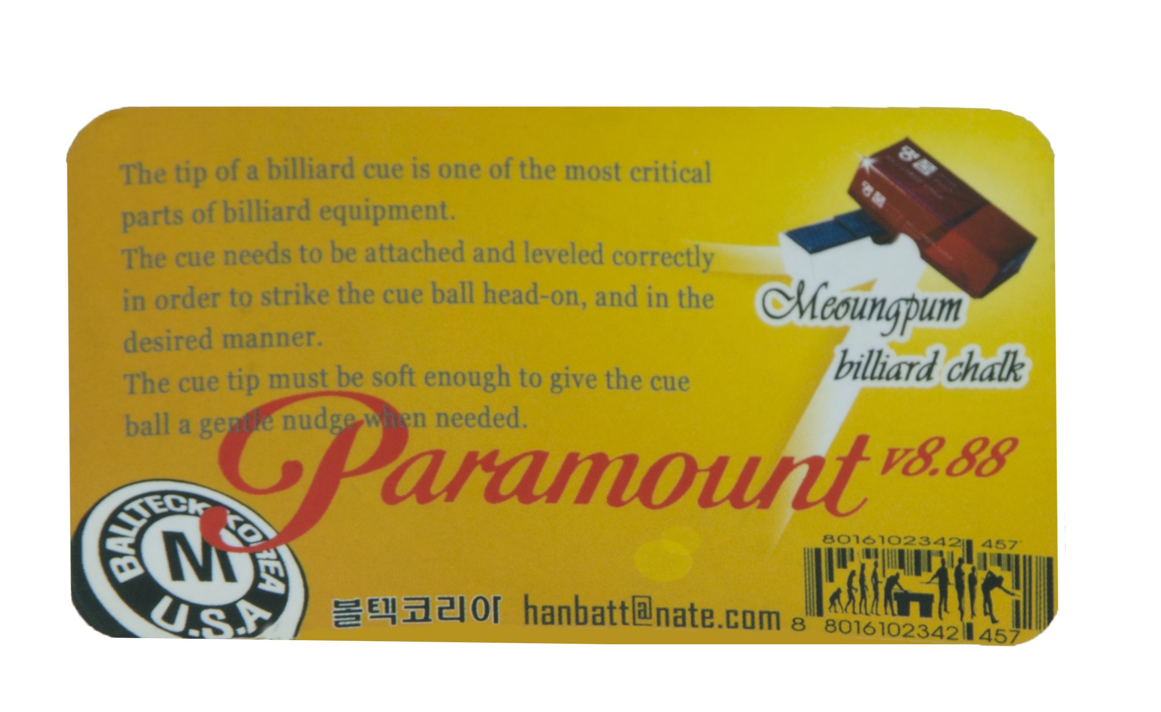 Долгое время сохраняется пружинность, что придает легкость ударам, также обладает хорошими адгезивными свойствами к мелу, что позволяет безошибочно выполнять целые серии ударов и обеспечивает безупречный контроль битка.