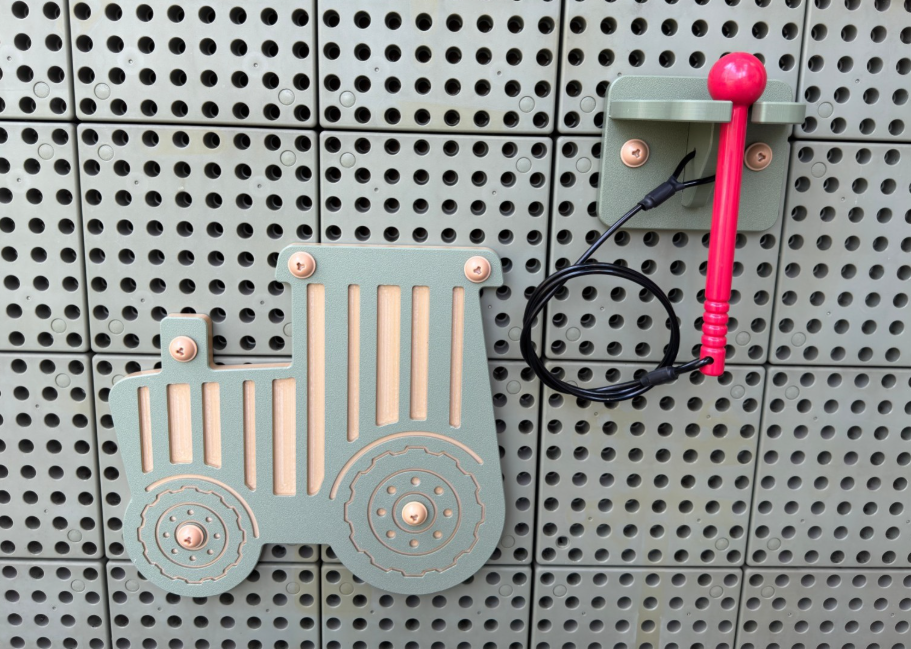 Музыкальный настенный трактор — простой ударный инструмент, по которому можно проводить или постукивать прилагаемым молоточком. Контрастные выступы и текстуры на корпусе и колёсах трактора помогают создавать разнообразные ритмы и перкуссионные звуки.