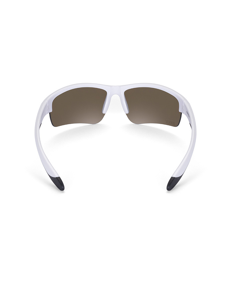 Глянцево-белая оправа изготовлена из прочного и сверхлегкого материала TPEE, что обеспечивает комфорт и высокую устойчивость к сильным ударам и вибрациям. Очки идеально облегают лицо благодаря анатомической форме, имеют отличную посадку с помощью гибких и легких душек с двойными резиновыми вставками на концах.