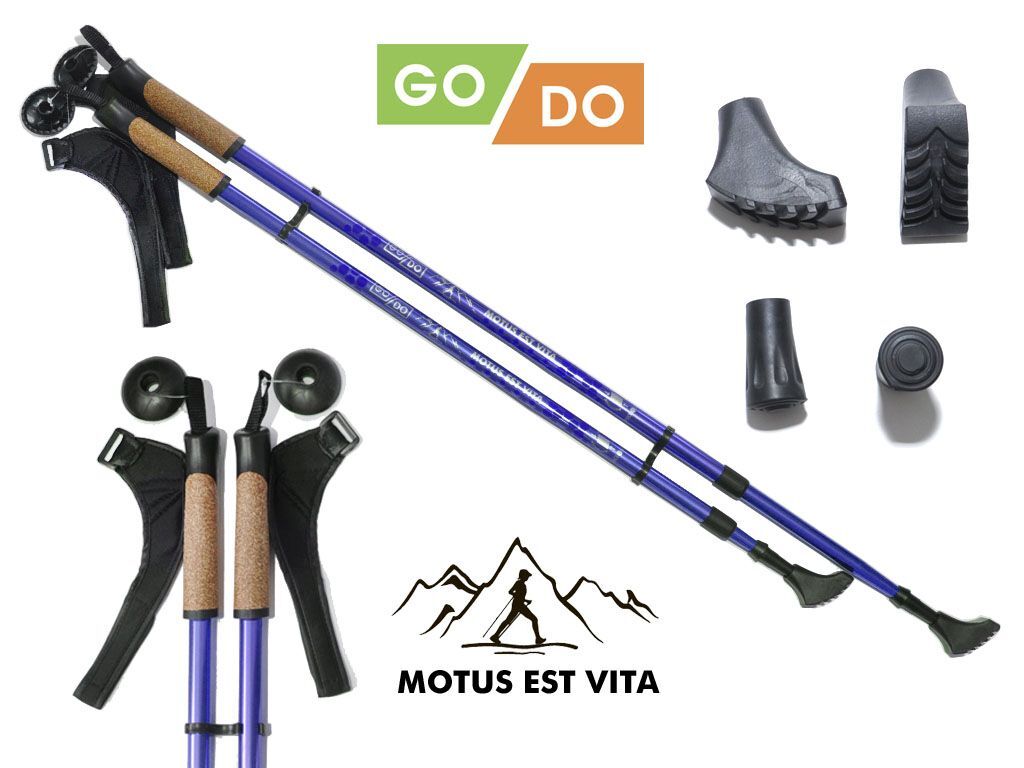 Палки для скандинавской ходьбы GO DO, облегчённые с активной амортизацией, двухсекционные (115 - 140 см). Материал: высококачественный лёгкий, при этом сверхпрочный алюминиевый сплав марки 6061, полипропилен, карбид. Ручки - пробковое дерево. В комплекте наконечники: капля (для твёрдого грунта), сапожок (для твёрдых и скользящих поверхностей), ограничительные кольца.