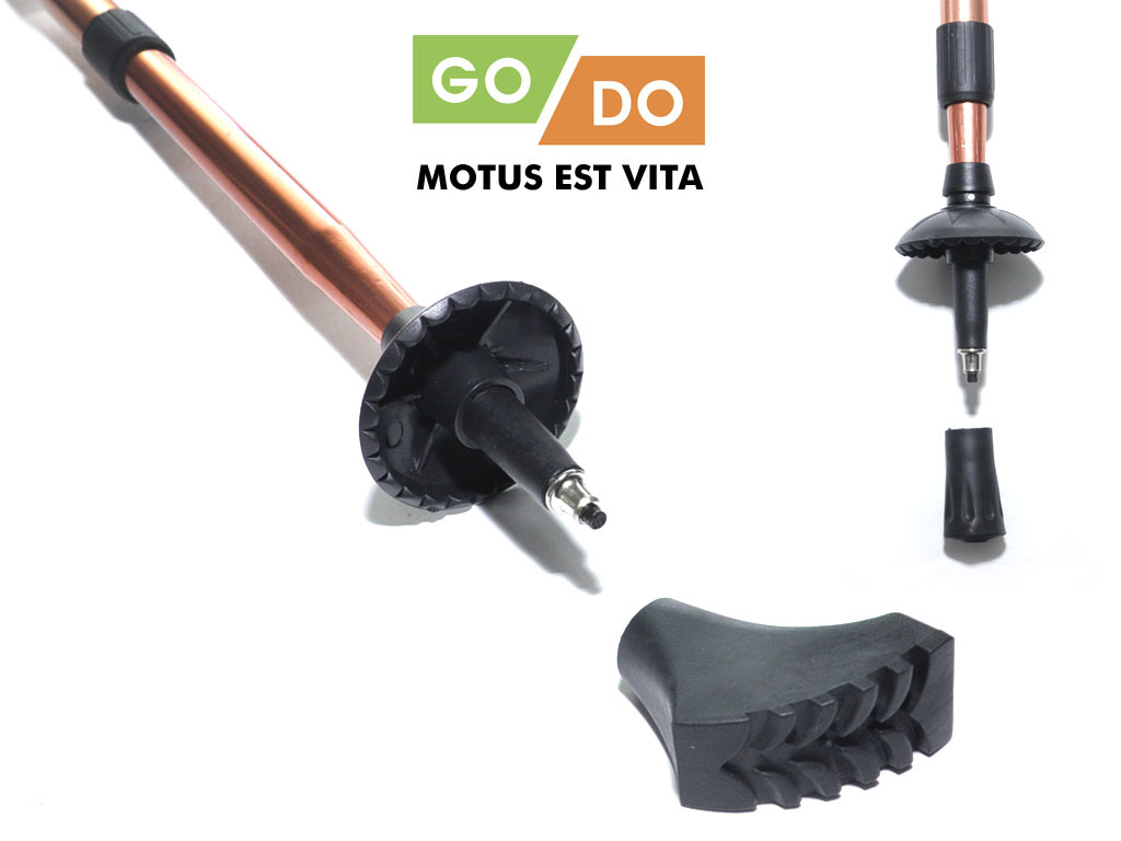 Палки для скандинавской ходьбы GO DO, облегчённые с активной амортизацией, двухсекционные (115 - 140 см). Материал: высококачественный лёгкий, при этом сверхпрочный алюминиевый сплав марки 6061, полипропилен, карбид. Ручки - пробковое дерево. В комплекте наконечники: капля (для твёрдого грунта), сапожок (для твёрдых и скользящих поверхностей), ограничительные кольца.