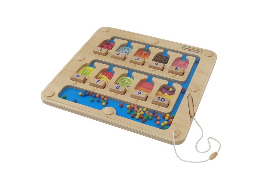 Панель представлена в виде магнитного лабиринта, который содержит 10 выемок в форме разноцветных эскимо. Под каждым эскимо расположен двусторонний деревянный блок, на котором с одной стороны изображена цифра, с другой стороны соответствующее количество точек. В нижней части панели расположены разноцветные магнитные шарики, которые можно перемещать с помощью магнитной ручки. Магнитная ручка закреплена на веревочке в правой части панели. Детям предлагается переместить необходимое количество магнитных шариков в каждое эскимо в соответствии с цифрой или количеством точек под эскимо.