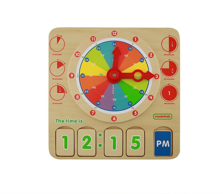 В нижней части панели расположен слот для размещения деревянных блоков с отображением цифровых показателей времени суток в 12 часовом формате AM и РМ. Ребенку предлагается указать правильное время, разместив блоки в соответствии с заданным временем на циферблате или наоборот.