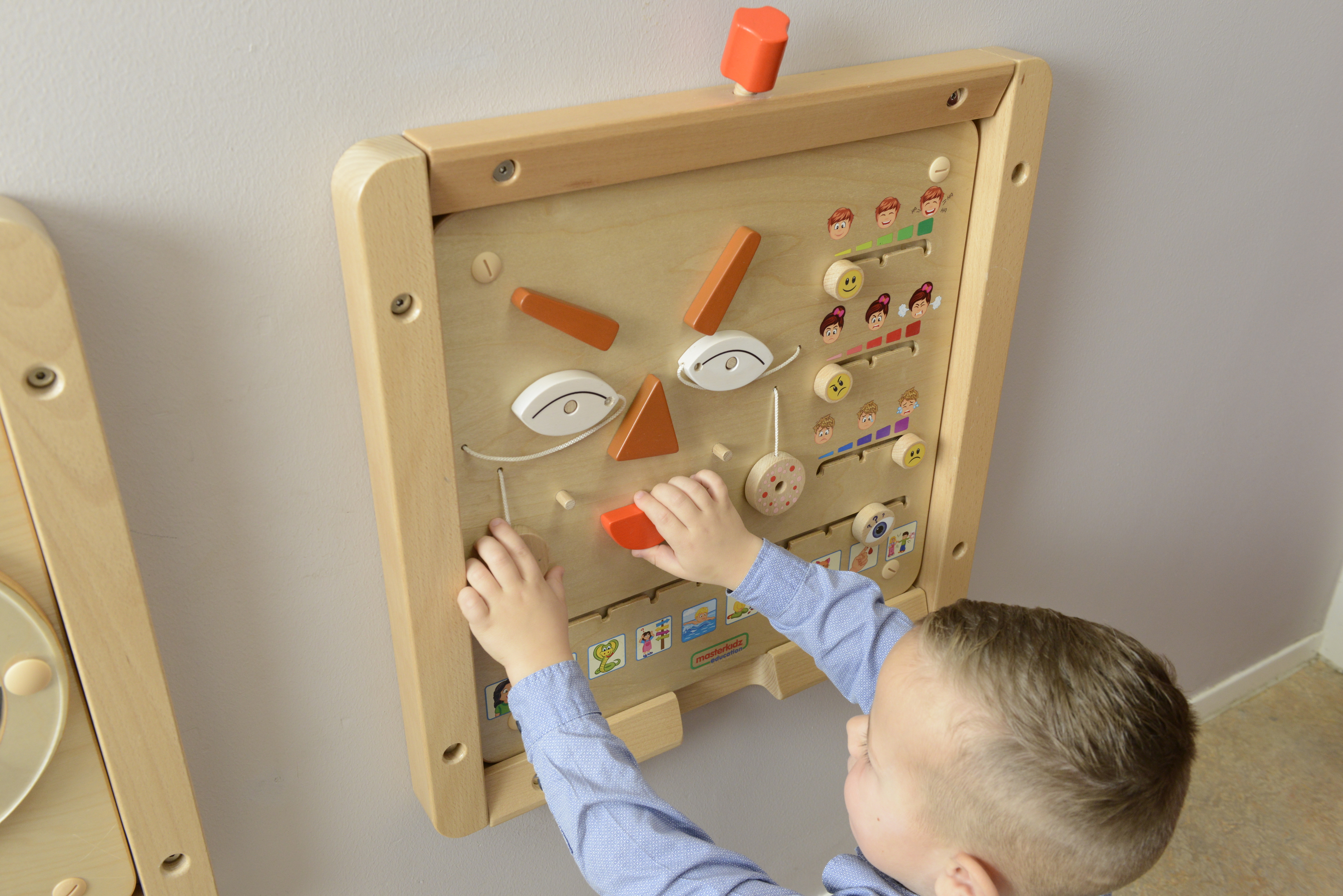 Пособие представляет из себя панель, выполненную из березовой фанеры, на лицевой части которой представлено лицо, позволяющее ребенку выражать эмоции, регулируя положение бровей, глаз, носа и рта. Он также может добавить слезы или румянец, когда ему грустно или стыдно и т.д.