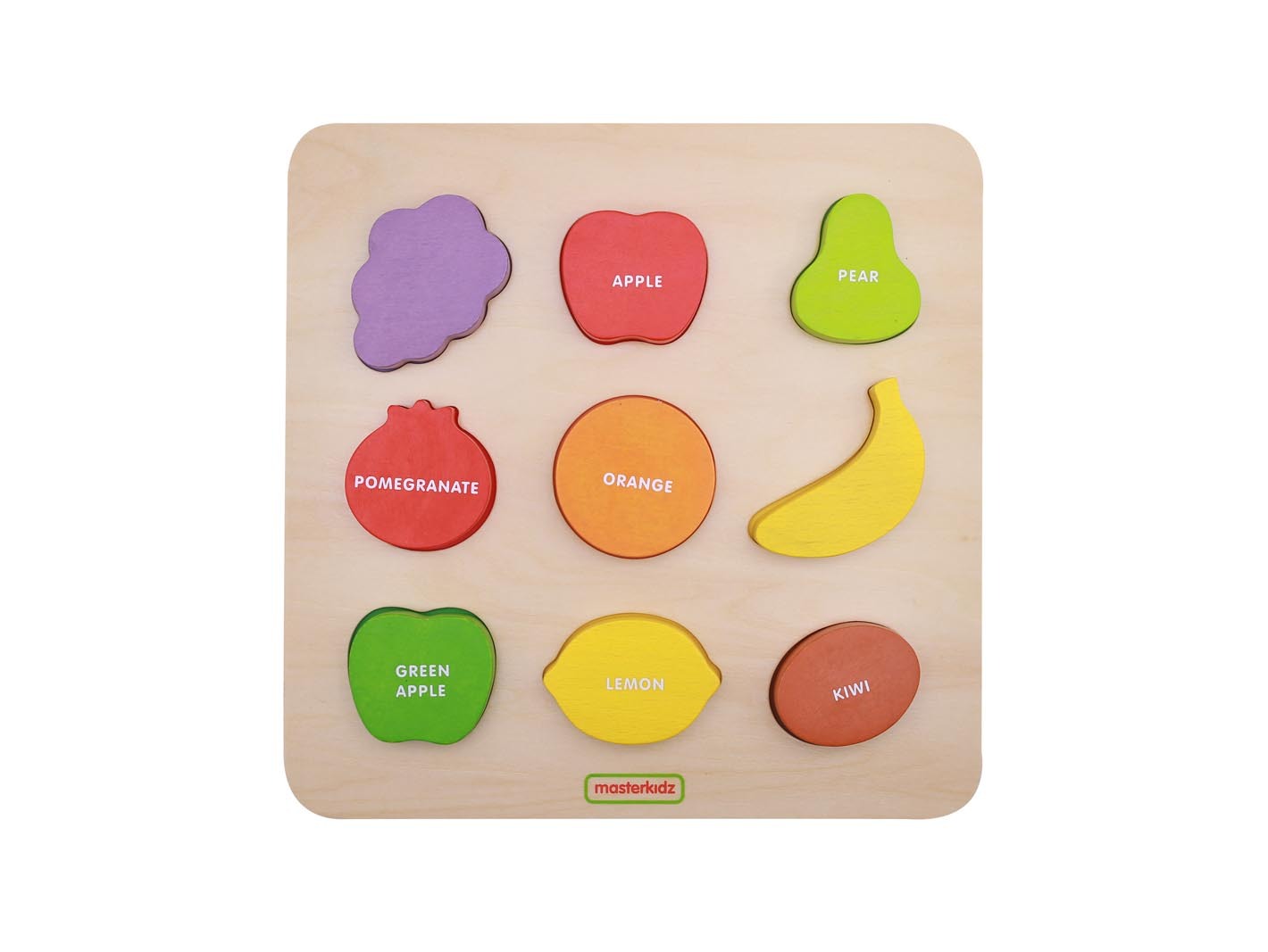 Пособие представляет из себя панель, выполненную из березовой фанеры, на поверхности которой имеется 9 выемок (3 на 3), в которые вставляются соответствующие по форме фигурки фруктов. В наборе 9 фигурок фруктов, изготовленных из массива бука. Название фрукта на каждой из фигурок подписано на английском языке. Фигурки небольшие по размеру, их удобно держать в детской ручке. Цвет каждого фрукта аналогичен цвету соответствующей ему выемки.