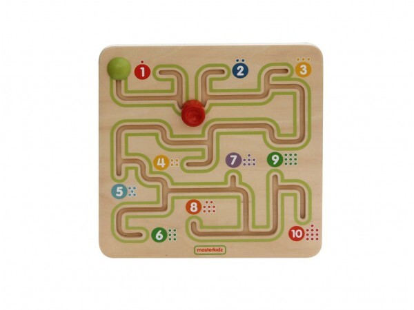 Панель-лабиринт представлена в виде маршрута, соединяющего числа от 1 до 10. Каждое число похоже на автобусную остановку, и на каждой остановке есть соответствующее количество точек, которые можно сосчитать. Каждая пронумерованная остановка также обозначена разным цветом. Задача ребёнка — провести бегунок красного цвета по лабиринту от одного числа к другому. Можно предложить найти определенное число.