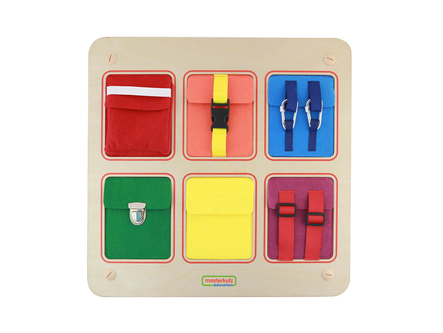 Панель "Ловкость рук 1" предназначена для отработки навыка открывания и закрывания разных типов застежек. Дети могут практиковать ловкость рук, мелкую моторику и зрительно-моторную координацию.