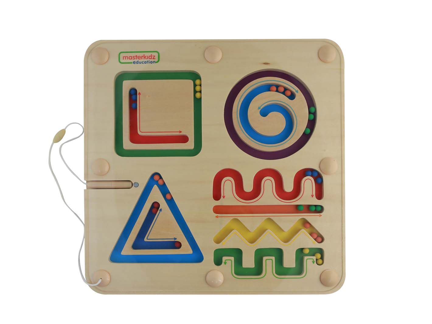 Пособие представляет из себя панель, выполненную из березовой фанеры, на поверхности которой имеются разноцветные магнитные лабиринты в виде геометрических фигур (квадрата, треугольника, круга) и различных линий (пилообразной, извилистой, прямой и ломаной), с прорезями-дорожками, в которых расположены разноцветные магнитные шарики. В левой части панели закреплена магнитная ручка на веревочке. Ребенку необходимо с помощью магнитной ручки перемещать шарики по дорожкам лабиринтов.