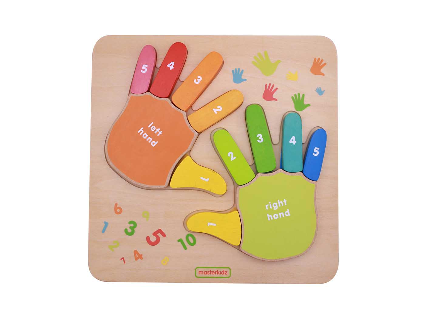 Пособие представляет из себя панель, выполненную из березовой фанеры, на поверхности которой имеются углубления, в которые вставляются кисти правой и левой рук, каждая из которых подписана. Каждый из пальцев с одной стороны пронумерован, а с другой стороны - написано его название. Пальцы и ладони рук представлены в различных ярких цветах. Углубления на панели под кисти рук выполнены в аналогичных цветах. Детям предлагается разместить кисти рук на панели в соответствии с цветом.