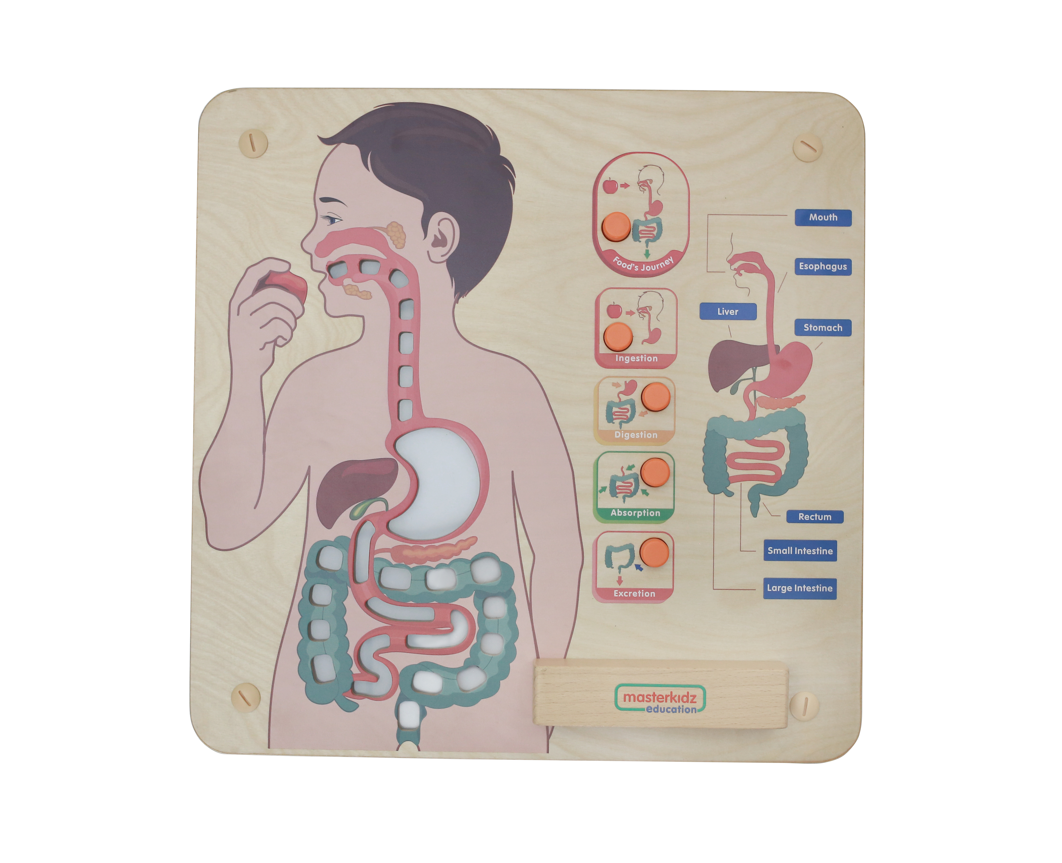 Панель "Пищеварительная система" предназначена для знакомства детей со строением и работой пищеварительной системы человека, которая состоит в том, чтобы расщеплять пищу, которую мы едим, на более мелкие единицы, называемые питательными веществами, которые всасываются в кровоток и обеспечивают жизнедеятельность организма.