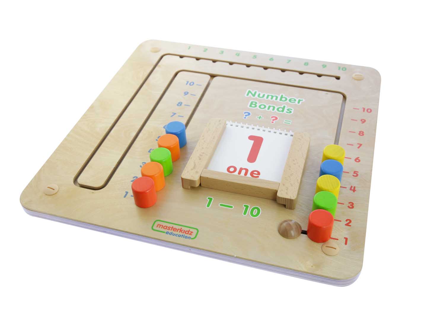 Пособие представляет из себя панель, выполненную из березовой фанеры, на лицевой части которой выполнены вертикальные и горизонтальные прорези-дорожки, в которых подвижно закреплены 10 счётчиков в виде разноцветных бочонков-цилиндров. Рядом с горизонтальной и вертикальными дорожками нанесены цифры в виде числового ряда от 1 до 10. Две вертикальные шкалы показывают общее количество счётчиков в каждом столбце, подтверждая, что сумма чисел в каждом столбце равна 10. Таким образом, 5 плюс 5 равно 10, как и 1 плюс 9, 2 плюс 8 и так далее.