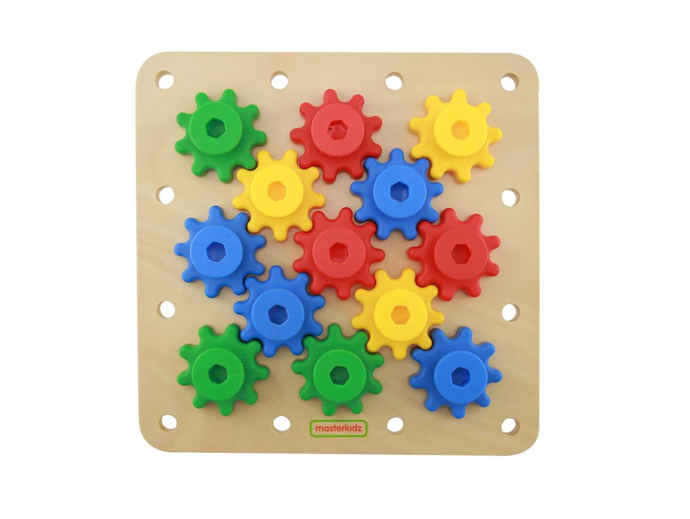 Пособие представляет из себя панель, выполненную из березовой фанеры, на поверхности которой имеются отверстия для крепления шестеренок с помощью болтиков. В комплекте 13 шестеренок и 13 болтиков (штифтов), выполненных их пластика в 4-х цветах. Ребенок, используя воображение, может создавать различные конструкции (шестеренки можно укладывать и многослойно). В результате «правильной» сборки (соединения шестеренок), зубчатая передача приводит в движение всю конструкцию!