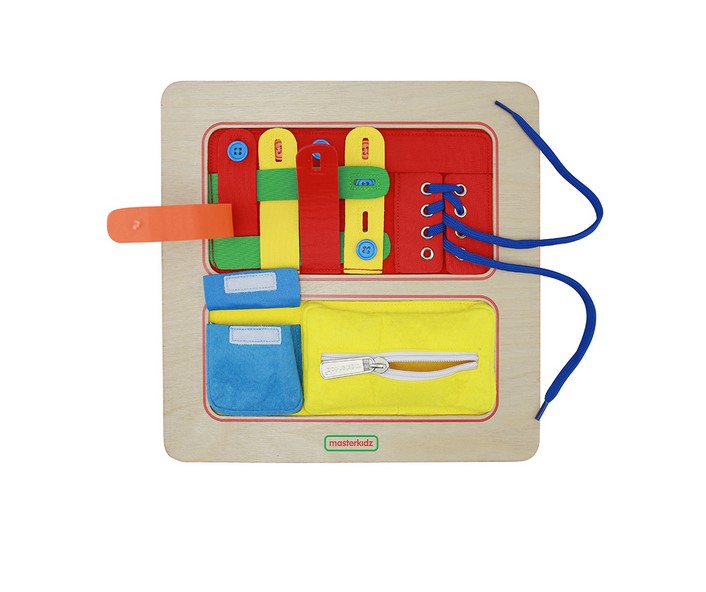 Обучающая панель "Шнурки и замочки" знакомит детей с различными застёжками, в том числе со шнурками, липучками, молниями и пуговицами. Способствует развитию мелкой моторики и координации движений, а также обучению бытовым навыкам (например, умению завязывать шнурки).