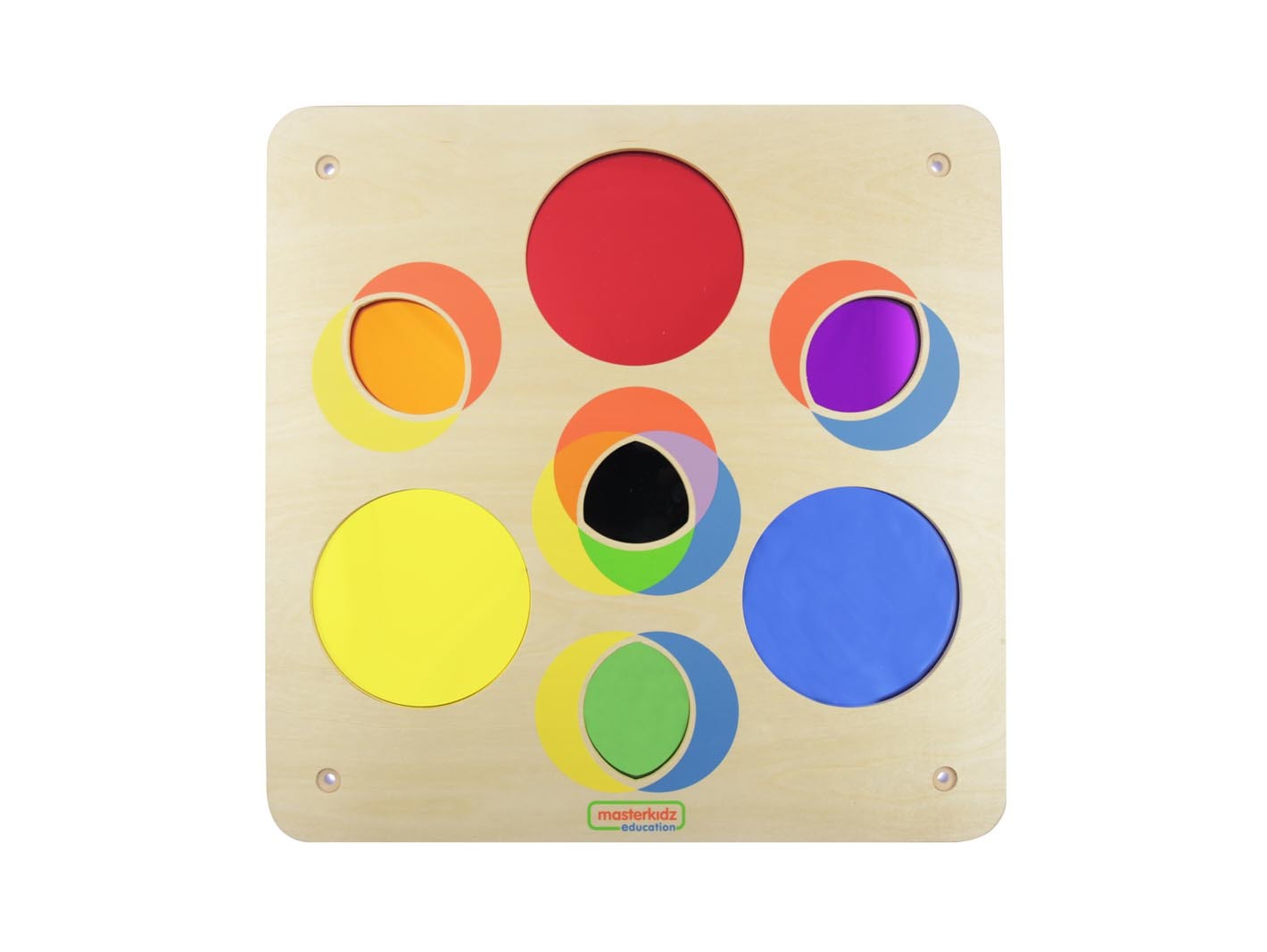- 3 лепестковых углубления, в которые вмонтирована зеркальная поверхность в 3-х составных цветах: оранжевый, зеленый, фиолетовый. Наглядно представлено, как составной цвет получается при смешивании 2 основных цветов.