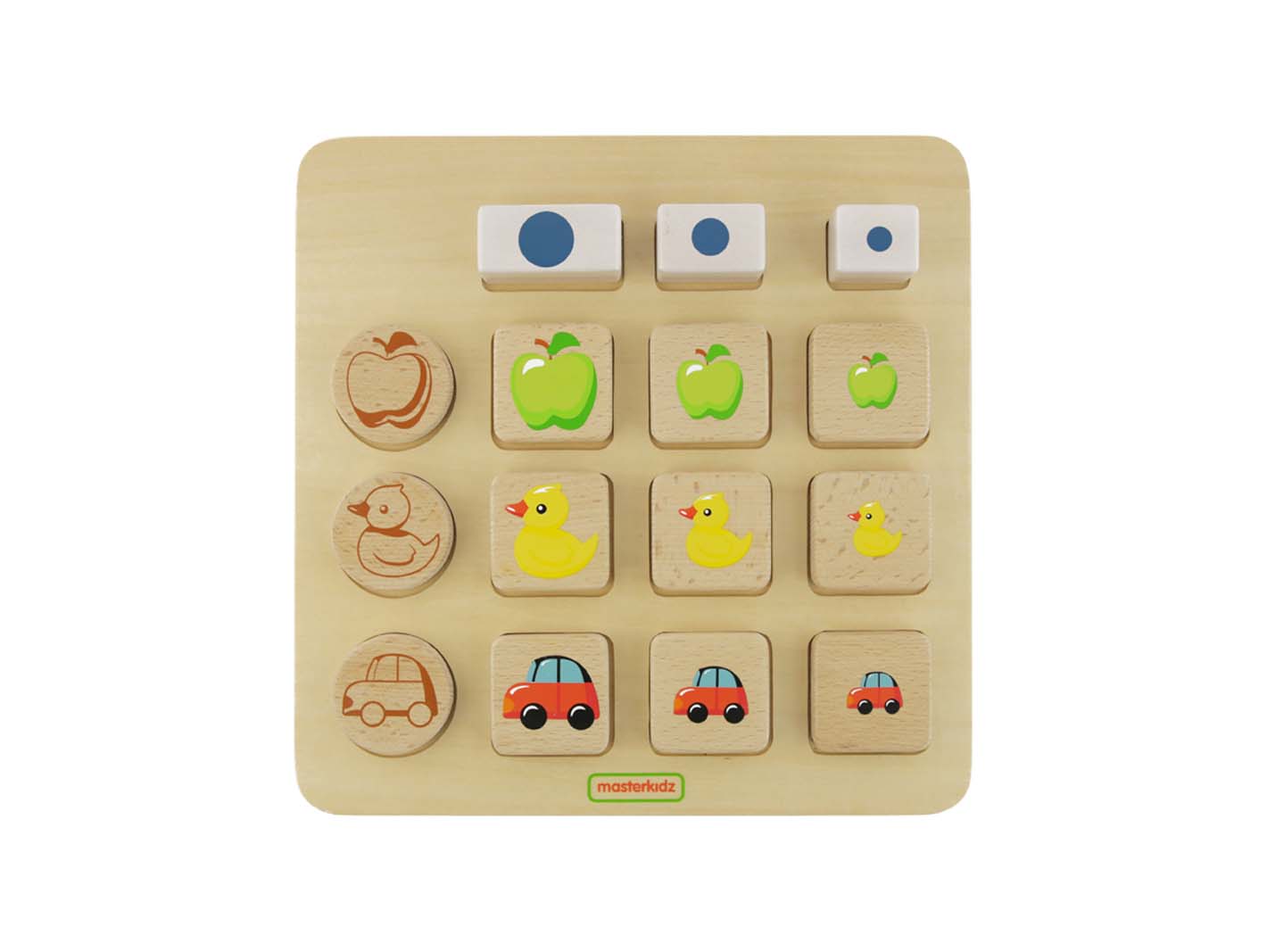 На панели нужно собрать «числовую матрицу» 3 на 3 из блоков. Сначала все блоки убираются, а затем раскладываются краевые элементы, чтобы задать задачу (матрицу). Верхний ряд из прямоугольных блоков и левый столбец из круглых блоков определяют содержимое строк и столбцов. Например, в первом столбце могут быть представлены предметы самого большого размера, а в первой строке — изображения яблока. Если это так, то ребёнок должен выбрать блок с изображением яблока самого большого размера и поместить его на место 1 в столбце 1.