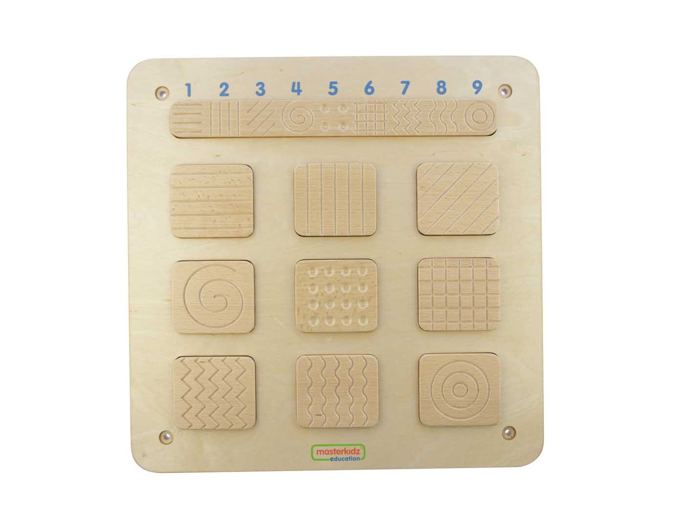 Пособие представляет из себя панель, выполненную из березовой фанеры, на лицевой части которой по основной площади в больших прямоугольных окошках расположены 9 образцов деревянных блоков с различной текстурой поверхности (выгравированы различные узоры), а в верхней части панели расположена горизонтальная планка, состоящая из аналогичных образцов текстурных поверхностей, которые пронумерованы от 1 до 9.