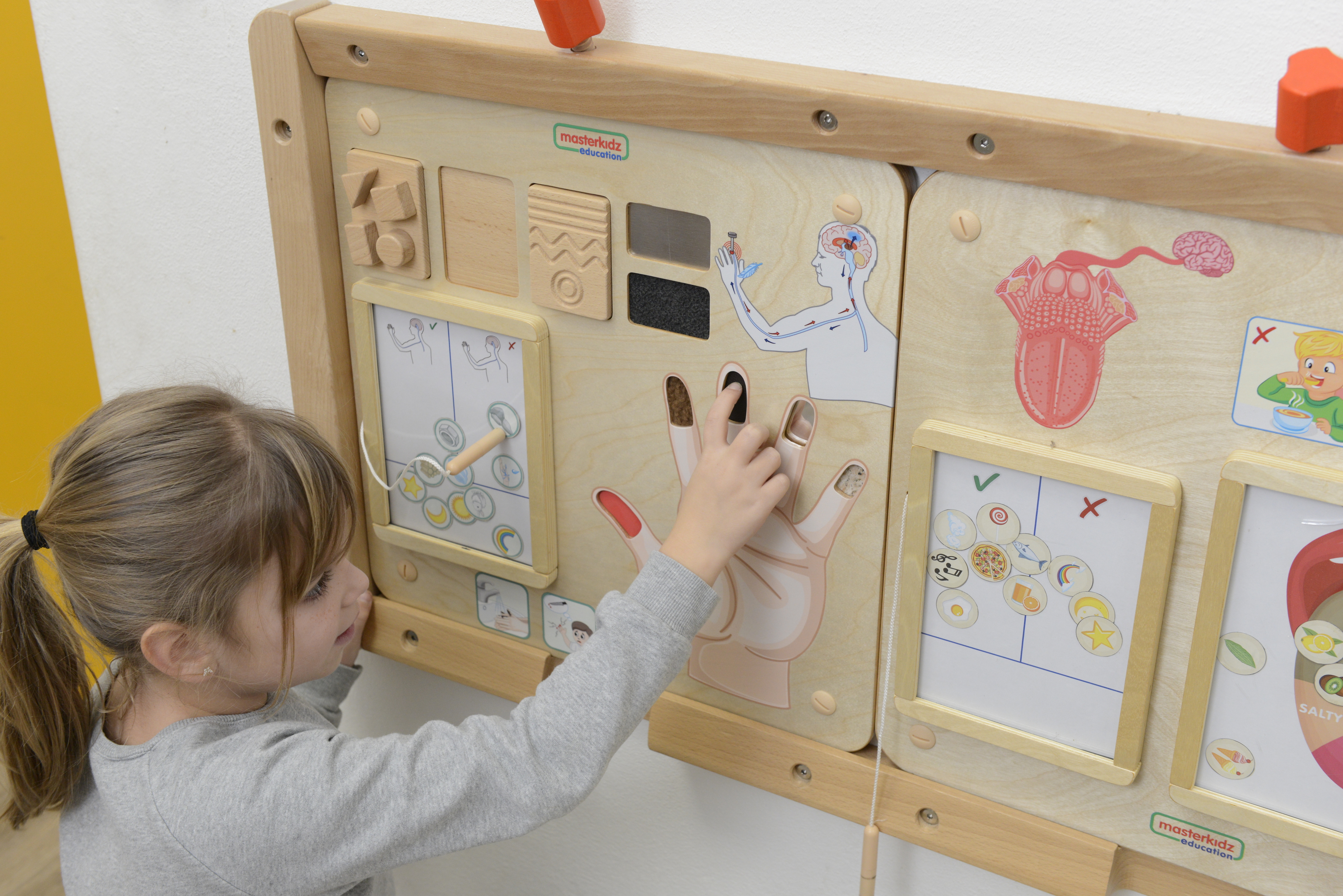 На лицевой части панели с правой стороны изображена кисть руки, на кончиках пальцев которой нанесены различные образцы материалов. Прикасаясь к ним, ребенок понимает, что наша кожа является органом осязания, который мы используем для определения шероховатости, гладкости, твердости, мягкости или различных форм объектов.