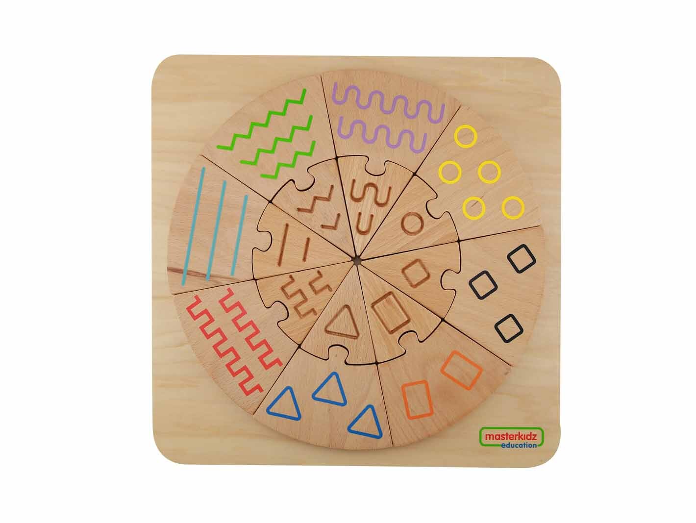 Пособие представляет из себя панель, выполненную из березовой фанеры, на лицевой части которой представлен круг, состоящий из 8 сегментов, каждый из которых имеет свой рисунок, но с одной стороны этот рисунок выгравирован, а с другой стороны - нарисован. Рисунки представлены в виде различных линий и геометрических фигур в 8 разных цветах. Каждый сегмент поделен на 2 части в виде пазла, имеющих общий рисунок и текстуру.