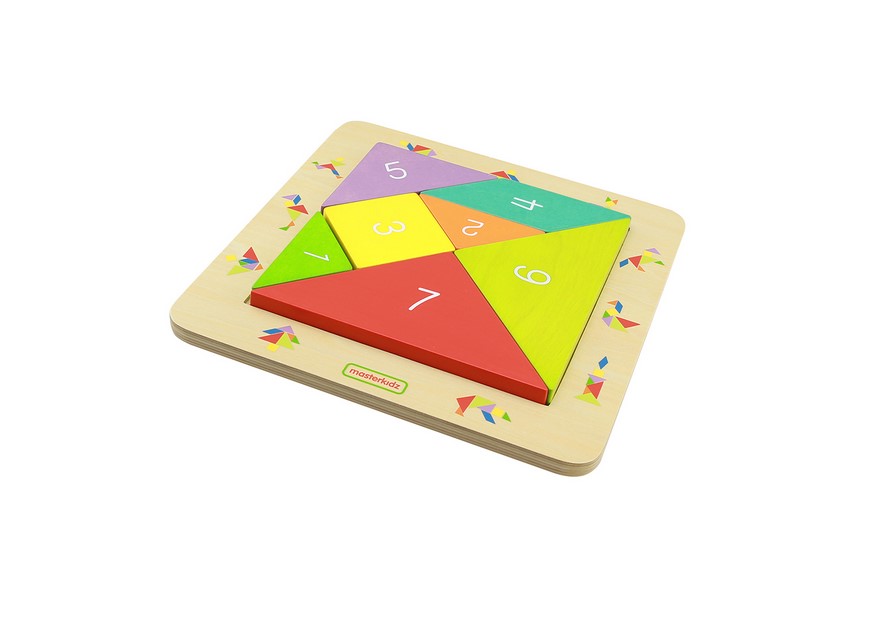 На лицевой стороне панели имеется квадратное углубление, где расположены детали головоломки. В наборе 7 деталей в виде геометрических фигур (5 треугольников, квадрат и параллелограмм). Головоломку на панели можно собирать, используя разметку в углублении в соответствии с формой деталей, или по собственному замыслу.