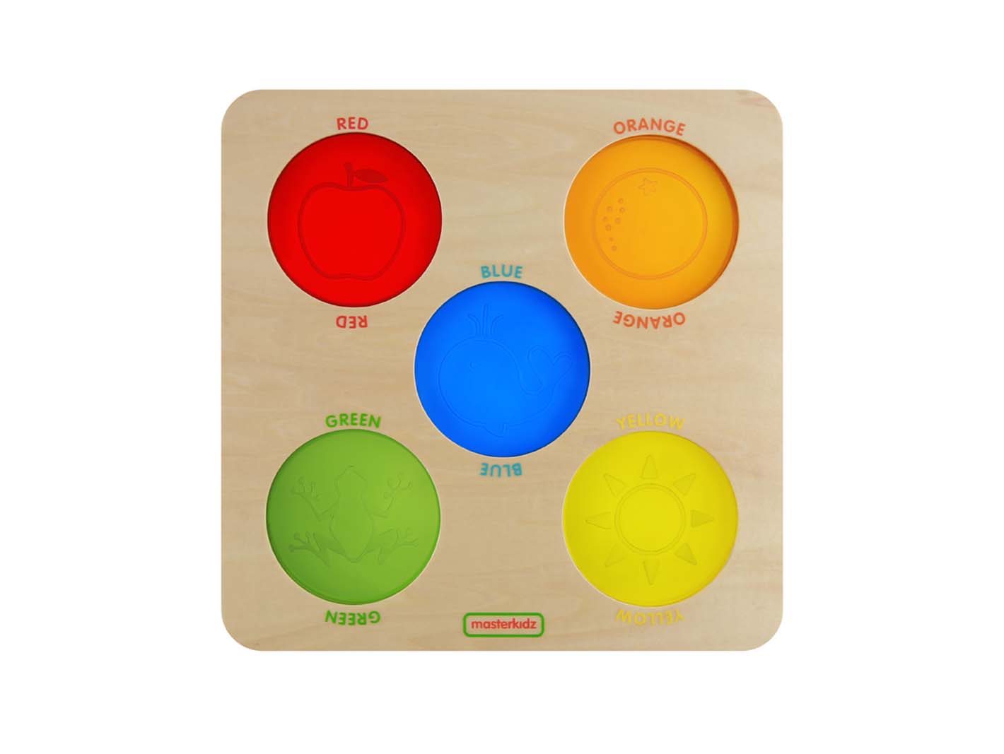 Пособие представляет из себя панель, выполненную из березовой фанеры, на поверхности которой имеются 5 круглых акриловых вставок в красном, желтом, синем, зеленом и оранжевом цветах (название цветов подписаны на англ. языке). Они прозрачные, поэтому, когда вы подносите их к глазу, мир кажется окрашенным в эти цвета. Кроме того, на поверхности акрила выгравированы контуры предметов, которые соответствуют этим цветам, включая зелёную лягушку, синего кита, жёлтое солнце, красное яблоко и оранжевый апельсин. Полезный ресурс для научных исследований и смешивания цветов на световой панели.