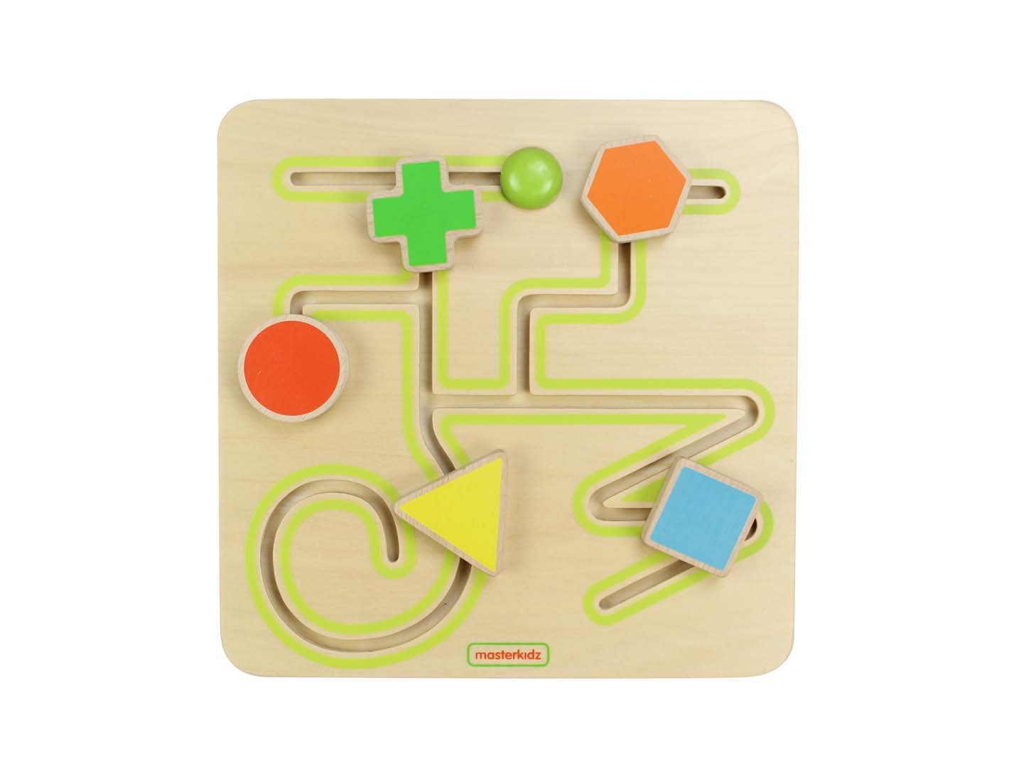 Пособие представляет из себя панель-лабиринт, выполненную из березовой фанеры, на лицевой части которой имеются прорези-дорожки, в которых подвижно закреплены 5 разноцветных фигур (треугольник, квадрат, круг, крест, шестиугольник). В начальной точке прорези имеется заглушка для изъятия фигур. В процессе игры, ребёнок может задействовать две руки одновременно, что способствует развитию правого и левого полушарий мозга.