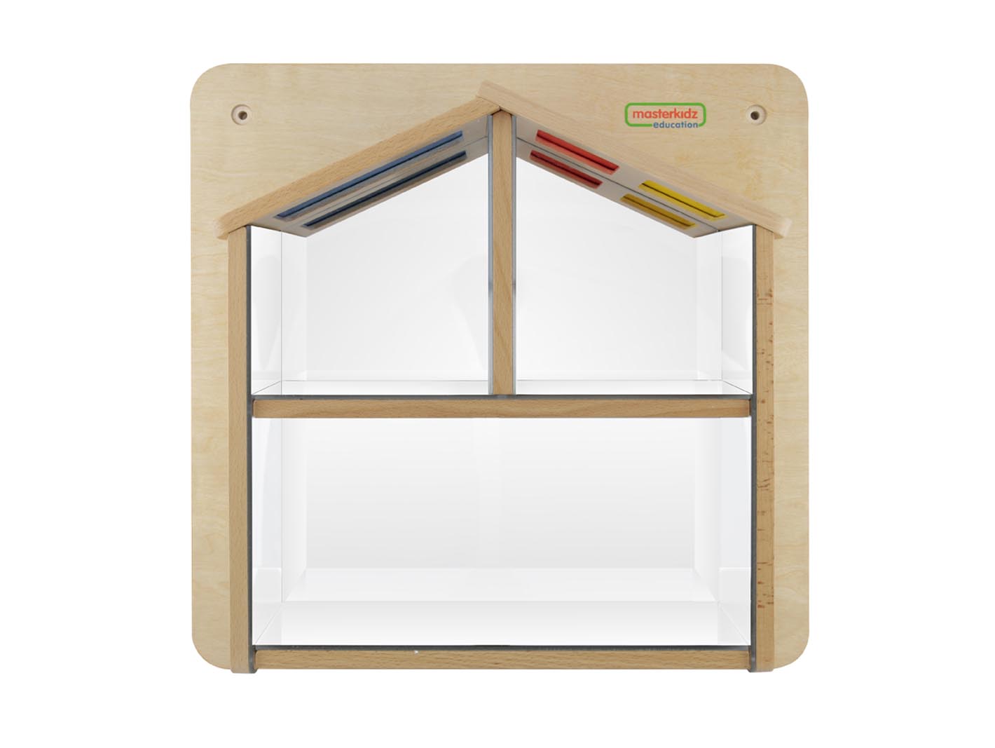 Пособие представляет из себя панель, выполненную из березовой фанеры, на основании которой смонтирован игровой домик. Домик разделен на 3 части, стены и пол в нём выполнены из зеркальных поверхностей. В потолке-крыше вырезаны 3 отверстия, закрытые цветным прозрачным акрилом. Зеркальные поверхности выполнены из акрила, что обеспечивает безопасность использования данного пособия. Акрил имеет превосходные отражающие характеристики.