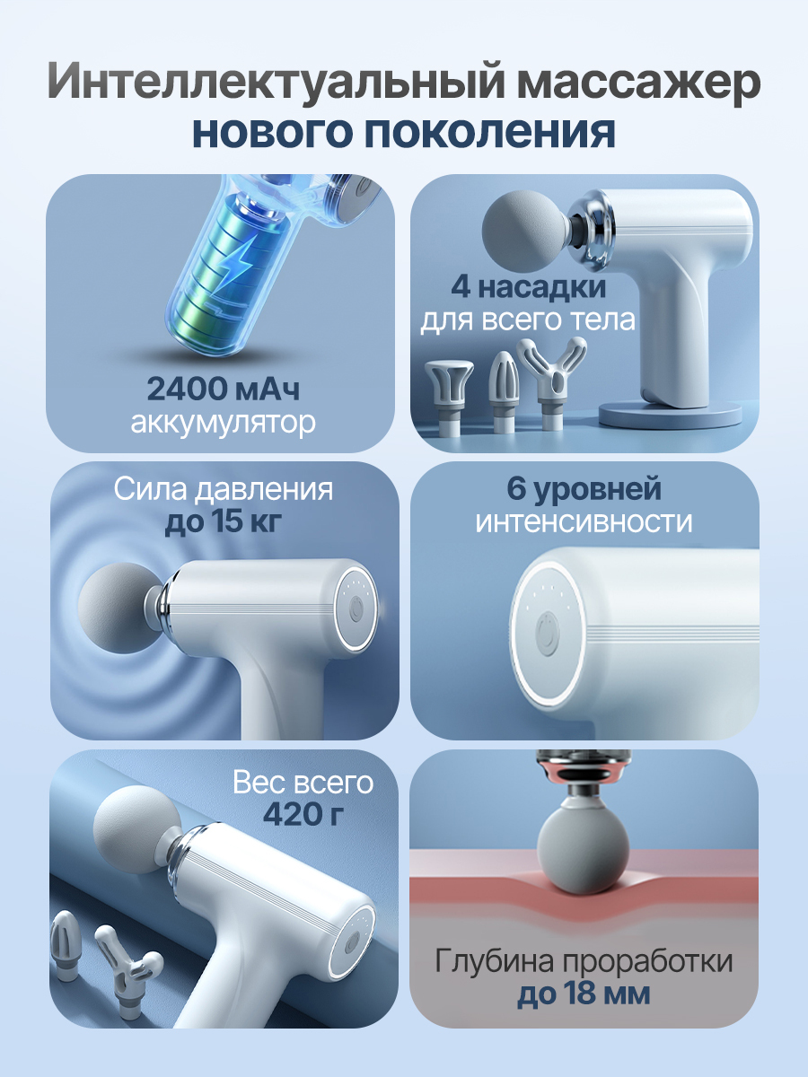 Устройство с шестью уровнями регулировки интенсивности позволяет подобрать оптимальный режим массажа для каждой зоны тела и любой степени нагрузки. Рабочий ход составляет 6 мм, что обеспечивает глубокое и точное воздействие на мышцы, а скорость вращения варьируется от 1600 до 4200 ударов в минуту, позволяя выбрать как мягкий расслабляющий, так и интенсивный восстанавливающий режим. Переключатель уровней интенсивности делает управление простым и удобным.