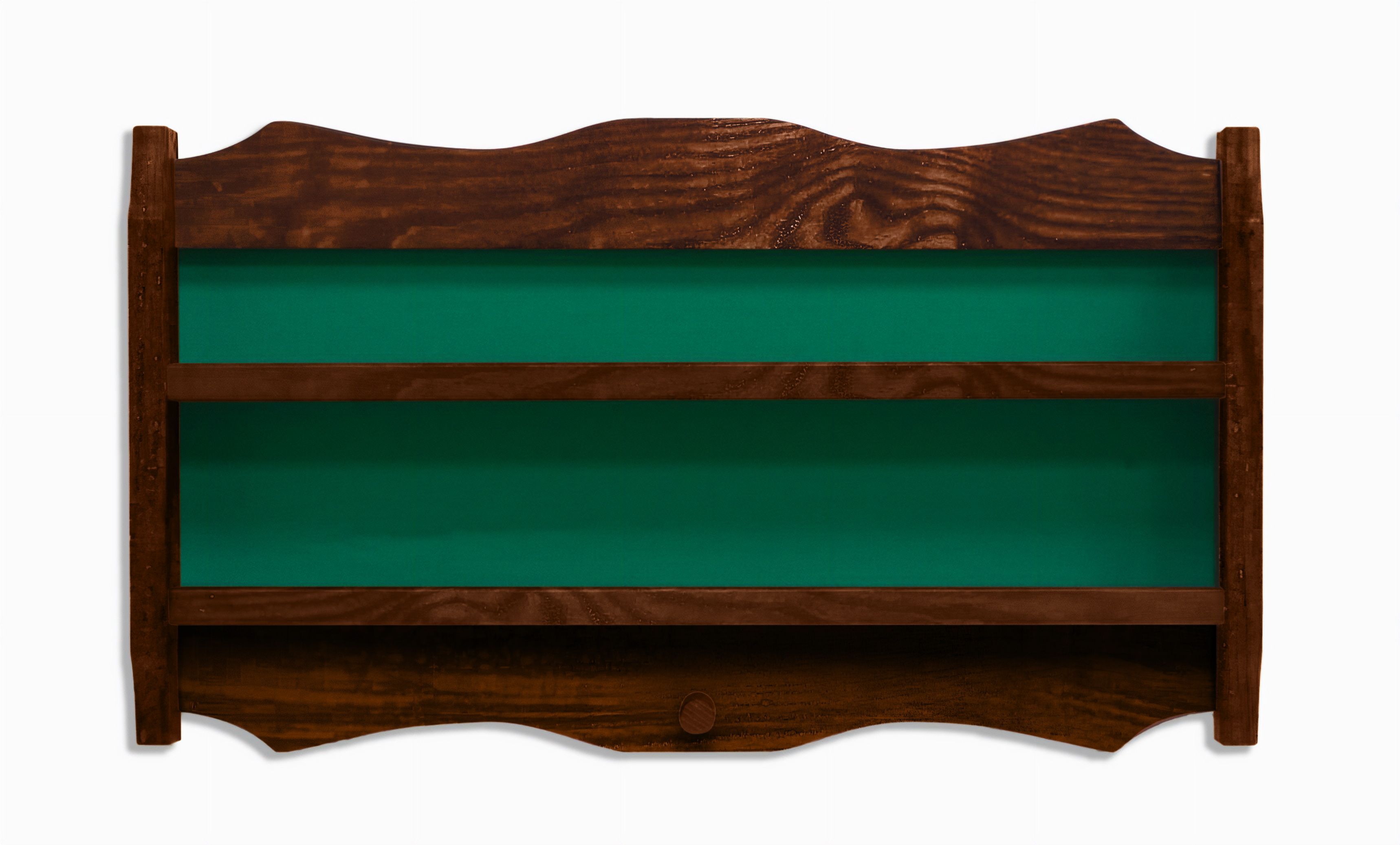 Две горизонтальные поверхности полки снабжены продольной нишей для лучшей фиксации шаров. Задняя панель обтянута сукном классического зеленого цвета.
