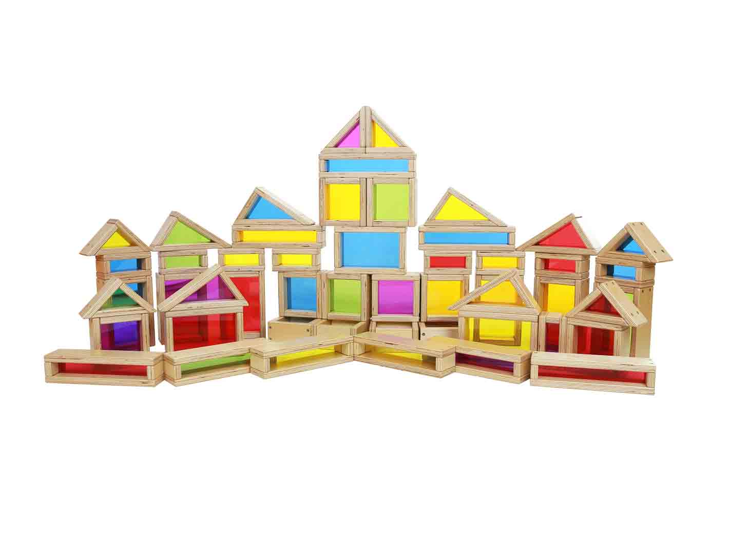 Игровой набор из 51 деревянного блока различной геометрической формы и размеров с прозрачными акриловыми вставками ярких цветов.