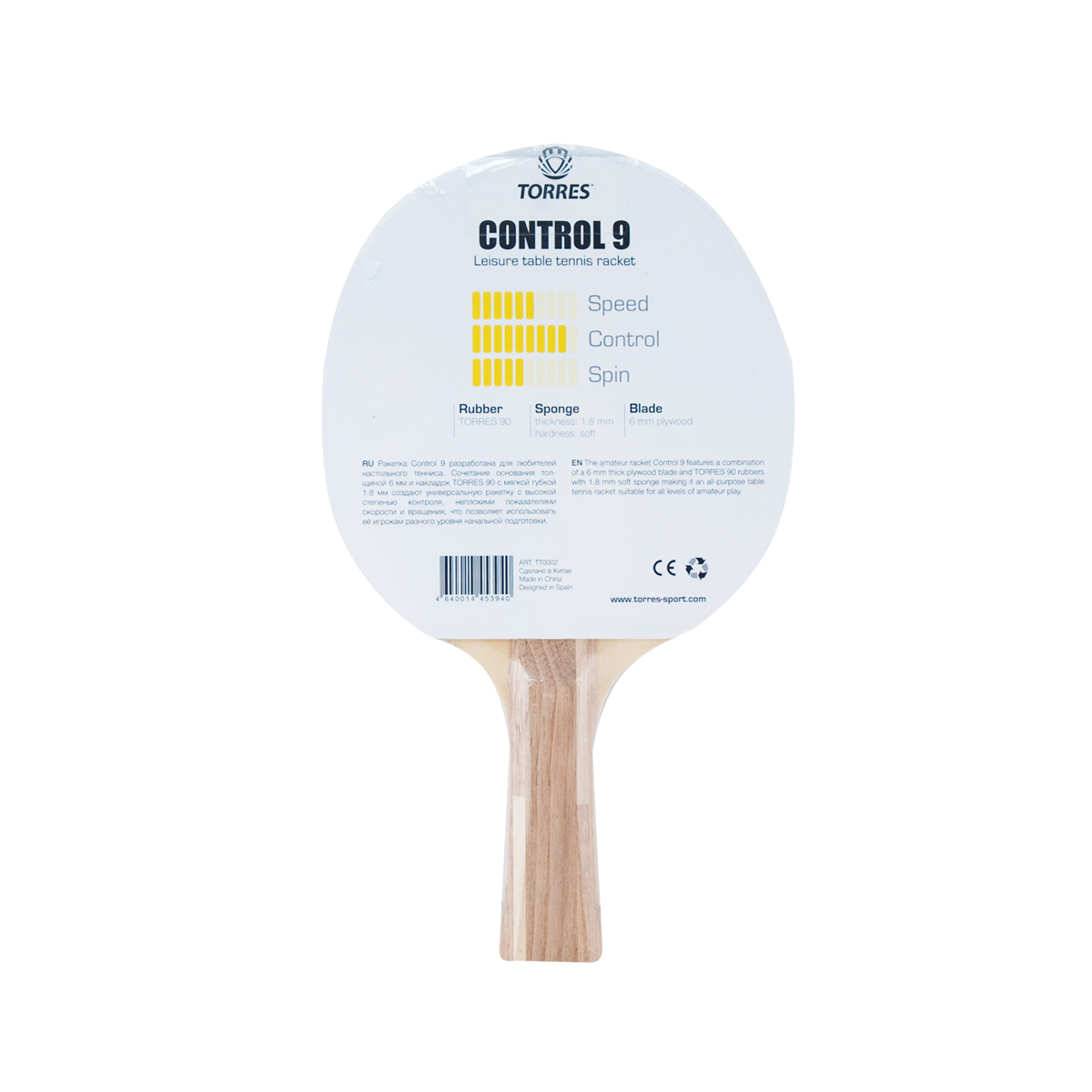 Ракетка Control 9 разработана для начинающих любителей настольного тенниса. Сочетание основания толщиной 6 мм и накладок TORRES 90 с мягкой губкой 1,8 мм создает уникальную ракетку с высокой степенью контроля, неплохими показателями скорости и вращения, что позволяет использовать ее игрокам разного уровня начальной подготовки.
