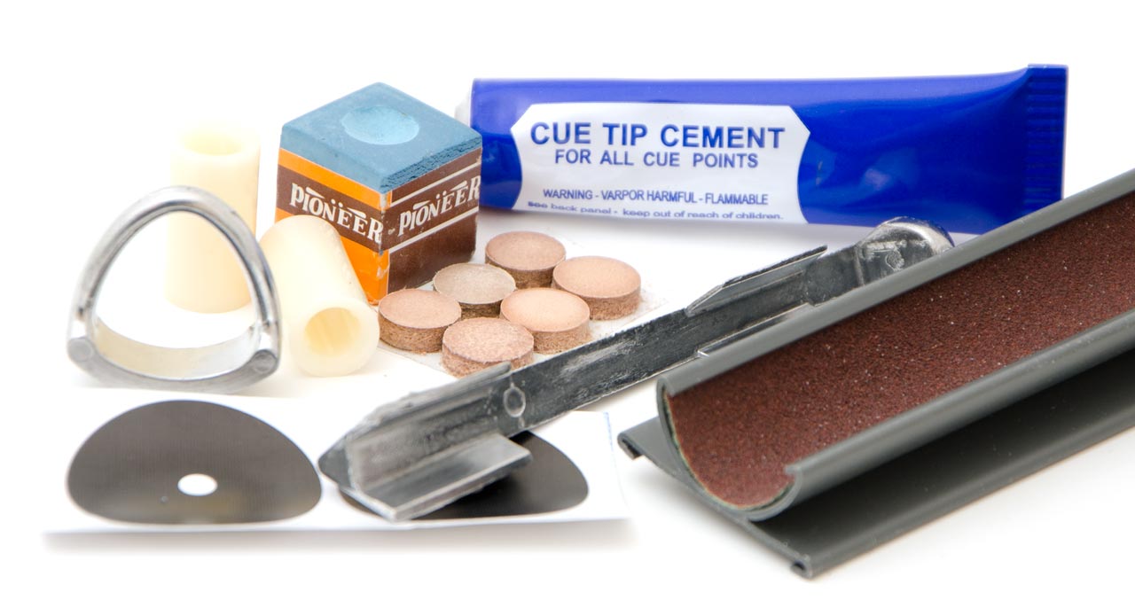 Комплект для ремонта включает в себя всё, что Вам необходимо для поддержания кия в должном состоянии. В него входят наклейки и втулки различных диаметров, клей, точилка для обработки наклейки, зажим для замены наклейки. Также в комплект включены метки для стола и мел.