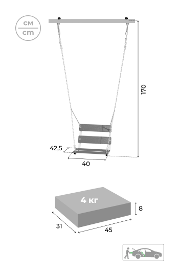 ROMANA «Качели цепные» надежно фиксируются на перекладине и так же легко снимаются благодаря специальным карабинам со втулкой. Качели прослужат не один сезон даже при ежедневном интенсивном использовании.