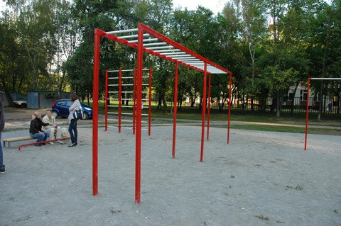 Спортивный снаряд состоит из четырех опорных столбов, изготовленных из металлических труб