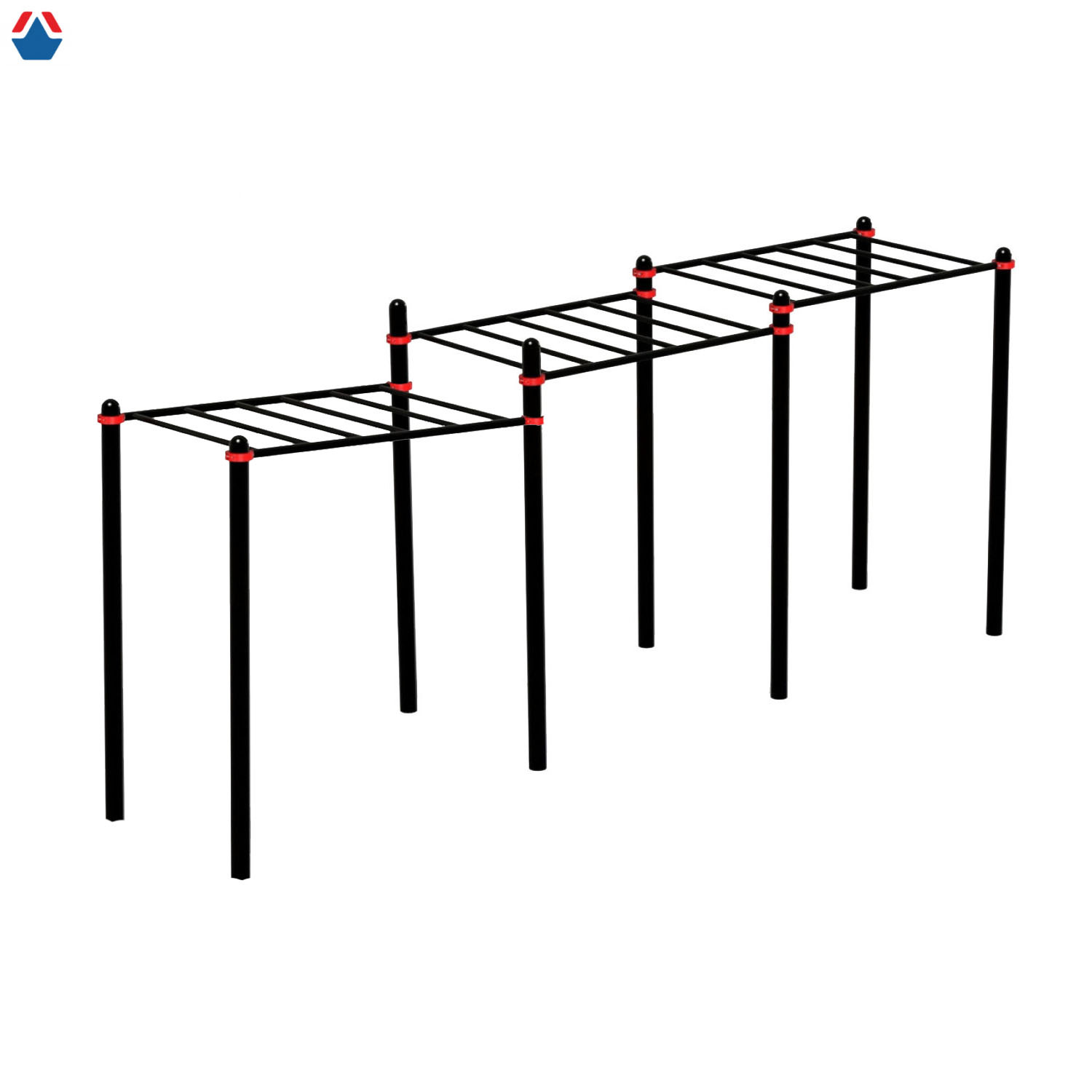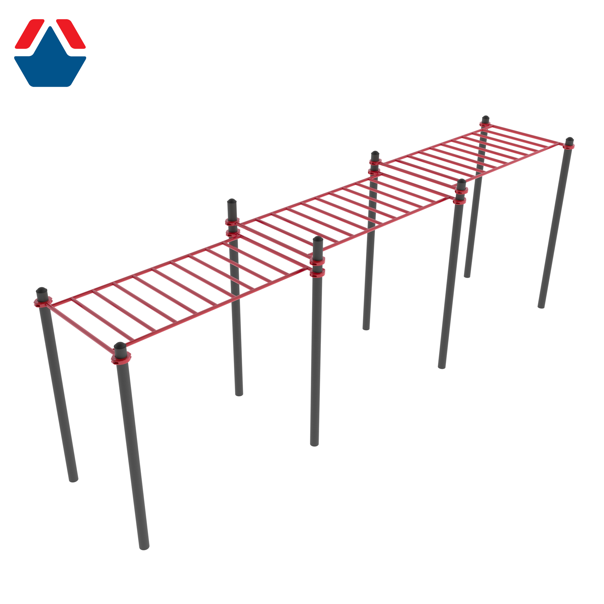 Трехуровневый рукоход, состоящий из трех секций, установленных на восьми вертикальных столбах с полусферическими заглушками, дает возможность несколько усложнить упражнение путем перехода с уровня на уровень и удлинения трассы. Любые занятия на рукоходах такого типа – это укрепление мышц рук, спины и брюшного пресса, а также отличная растяжка позвоночника, позволяющая избежать травм и не различных заболеваний.