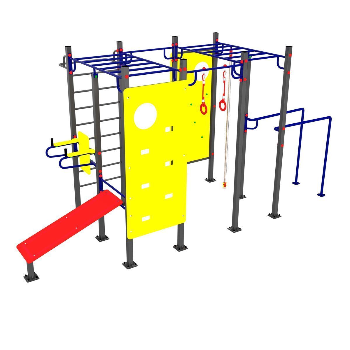 Конструкция комплекса рассчитана на круглогодичное использование и безопасна для детей. Оптимально подобранное сочетание спортивных снарядов – шведская стенка, турники, брусья, рукоходы, кольца, канат и скалодром – создаёт условия для гармоничного физического развития ребёнка: укрепления мышц, развития координации, ловкости и силы.
