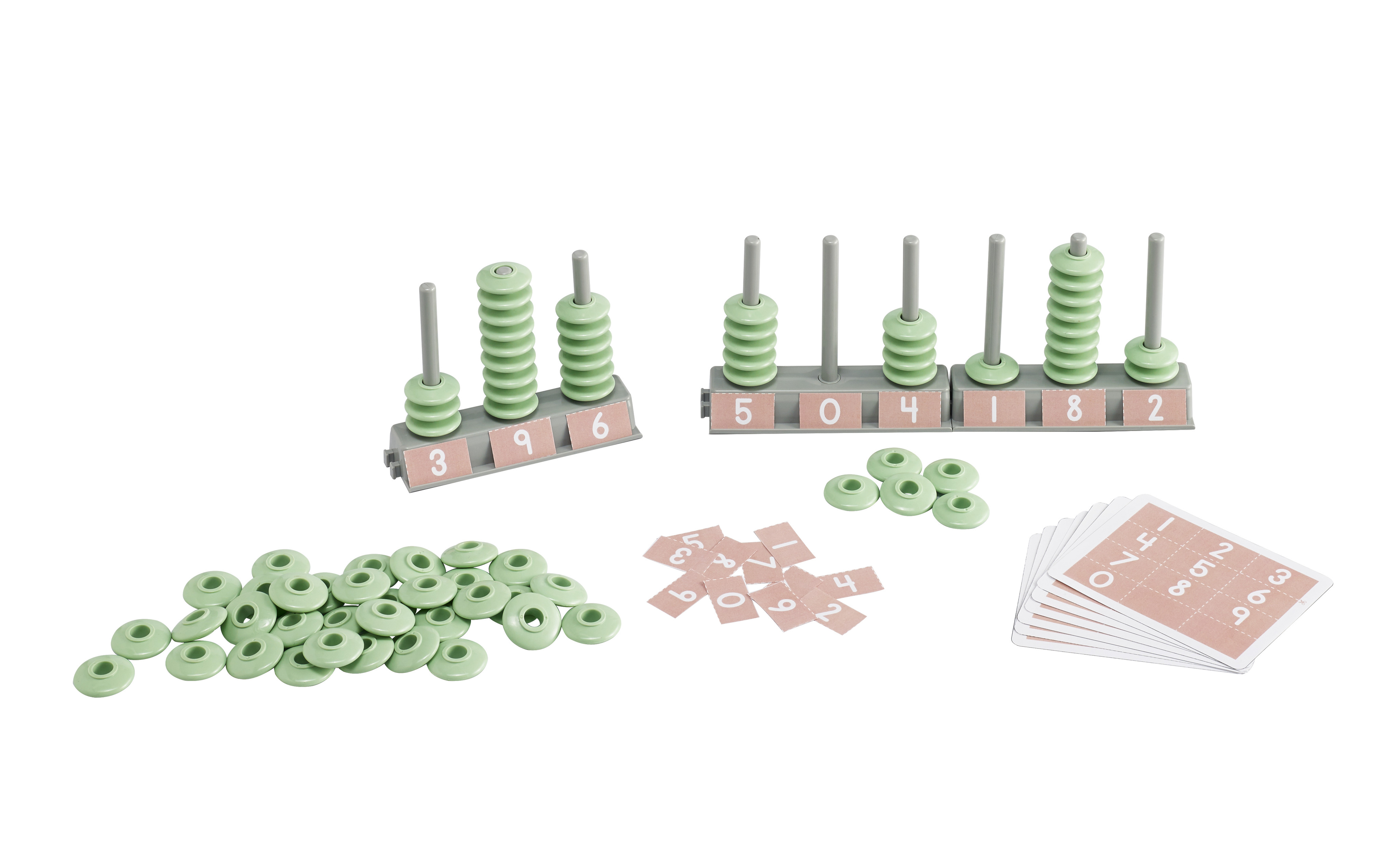 В наборе: 3 подставки, 9 стержней, 81 счетных бусин и 9 карточек с цифрами.