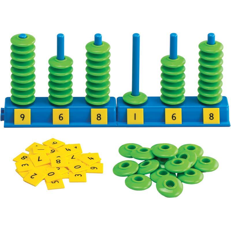 В наборе: 3 подставки, 9 стержней, счетные бусины (81 шт.), 9 наборов квадратных фишек с цифрами 0-9.