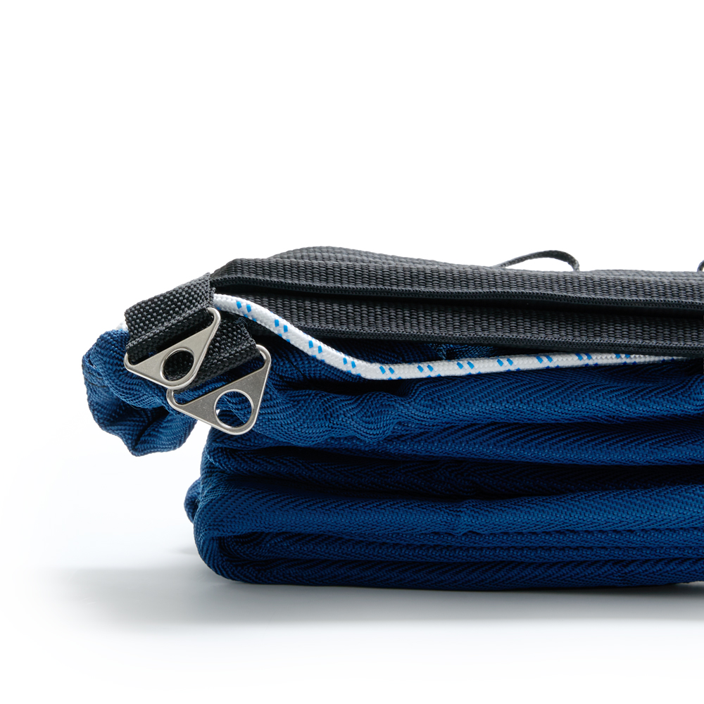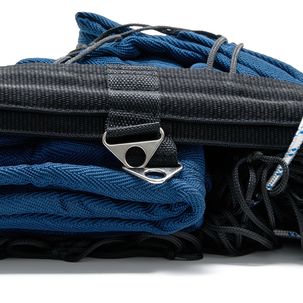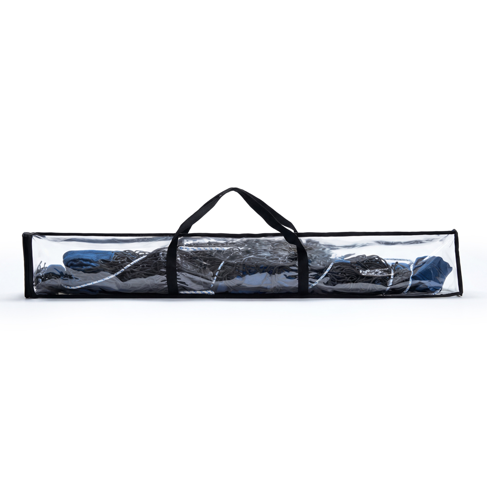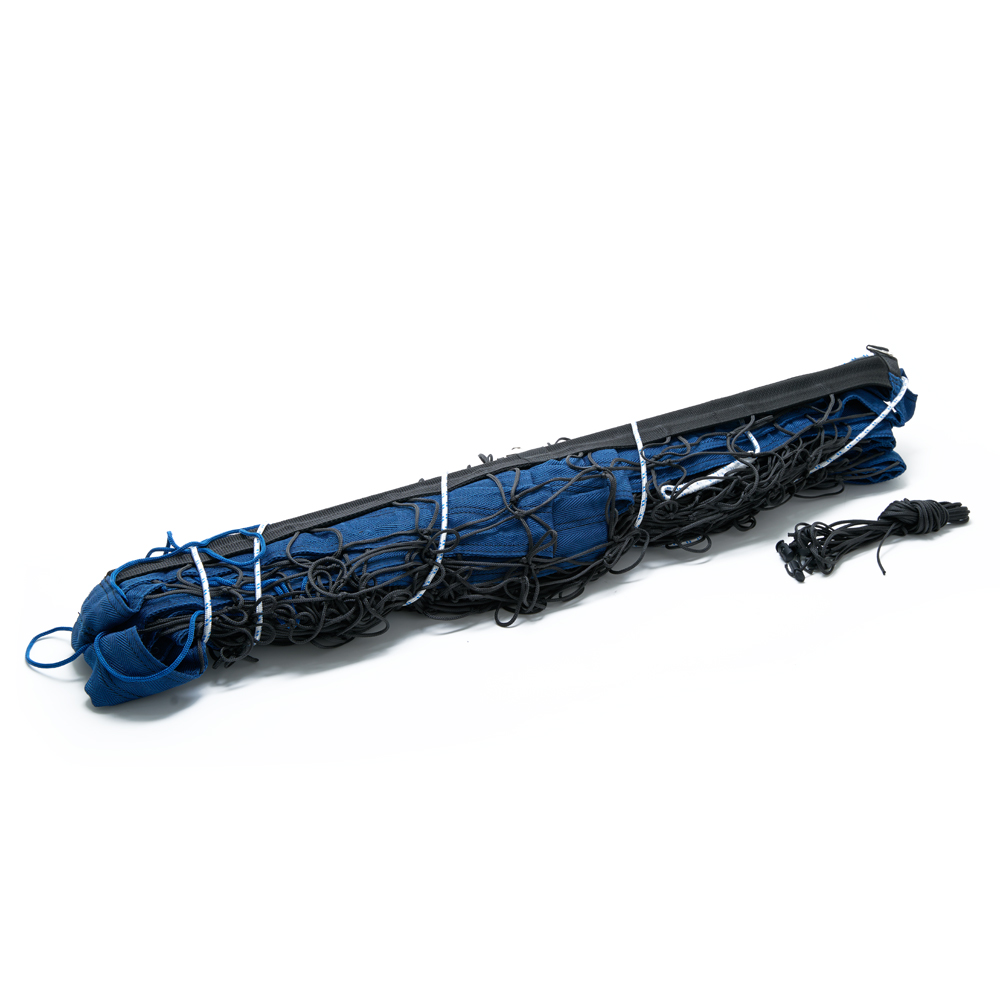 Верхние и нижние ограничительные ленты шириной 7,5 см из полиэстера синего цвета, боковые ленты шириной 5 см из полиэстера черного цвета. Полотно сетки из специального светостабилизированного, водоотталкивающего пропилена черного цвета (толщина нити 3,5 мм, ячейка 10см*10см). Применение данных материалов позволяет использовать сетку на открытых площадках при игре в агрессивных погодных условиях (яркий свет, дождь, высокая влажность, низкая температура воздуха) без угрозы растяжения и провисания полотна сетки, и разрушения структуры материала. Для равномерного натяжения сетки предусмотрены по 3 полипропиленовых шнура с каждой стороны, а также в боковые ленты вставлены фибергласовые стрежни, за счет чего сетка выглядит ровно натянутой даже при недостаточном натяжении троса и боковых шнуров.