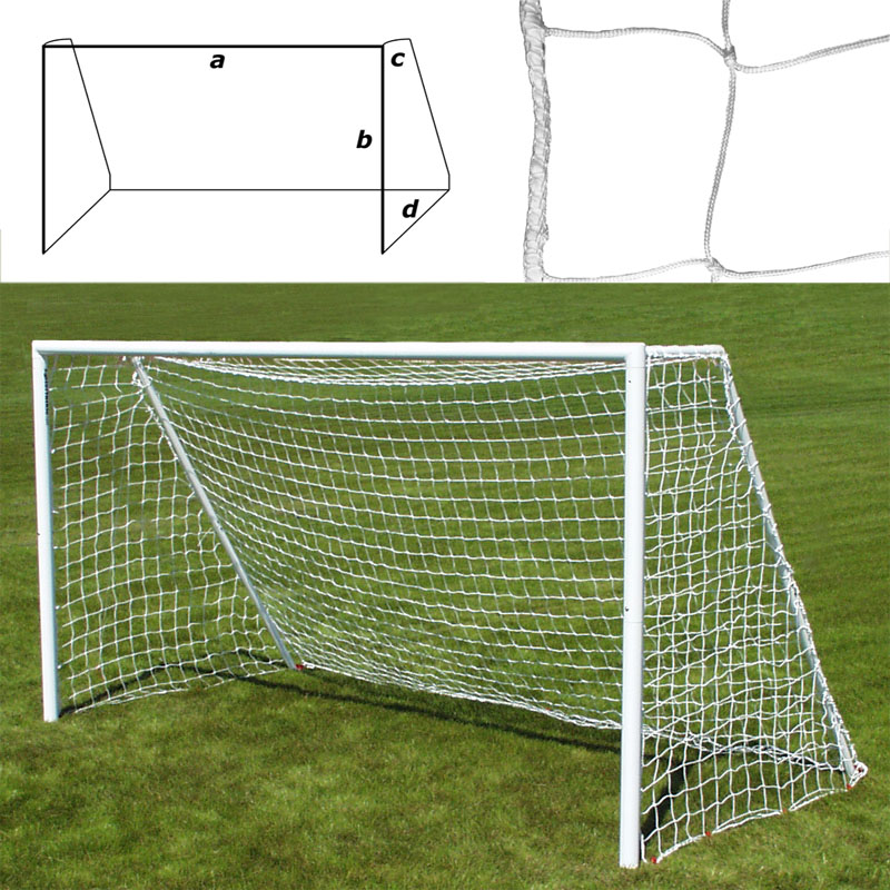 Сетка футбольная FS-F-№15 по форме ворот, размер a:7.5 b:2.5 c:1.2 d:2.0 м, нить 3,5 мм полипропилен (ПП), ячейка 10*10 см, цвет белый. Кромки сетки обработаны оверлоком.