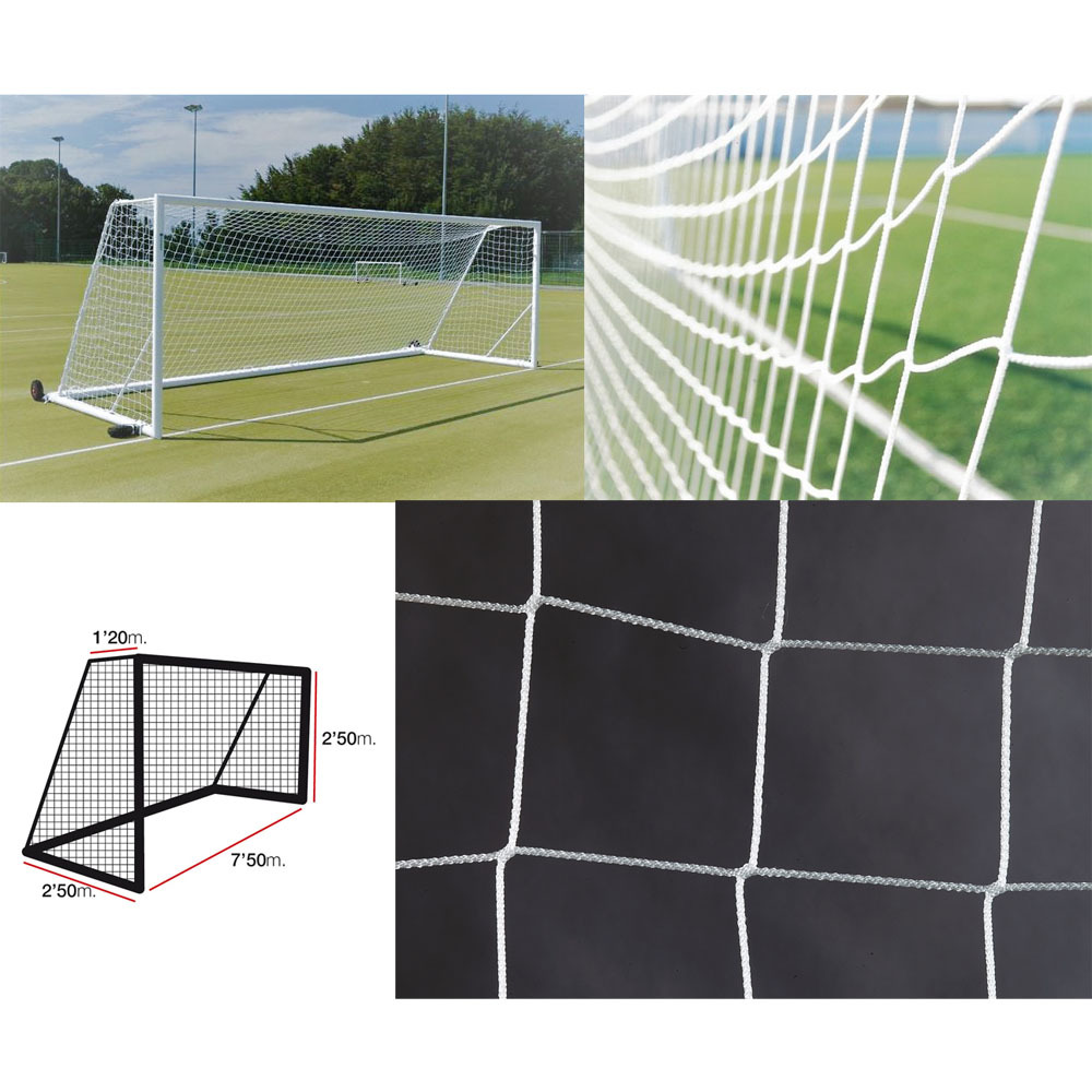 Сетка футбольная тренировочная "EL LEON DE ORO" арт.12443010000. Рекомендуется для игр и тренировок команд и клубов среднего уровня, для общеобразовательных учреждений. Произведена по безузловой технологии, ячейка - четырехугольная стандартного размера 10х10 см. Нить 3,0 мм светостабилизированный (защита от ультрафиолета) и стойкий к агрессивным атмосферным воздействиям полипропилен. Под размер ворот: а: 7.50 м (длина), b: 2.50 м (высота), c: 1.20 м (глубина ворот по верху), d: 2.50 м (глубина ворот по низу). Цвет белый.