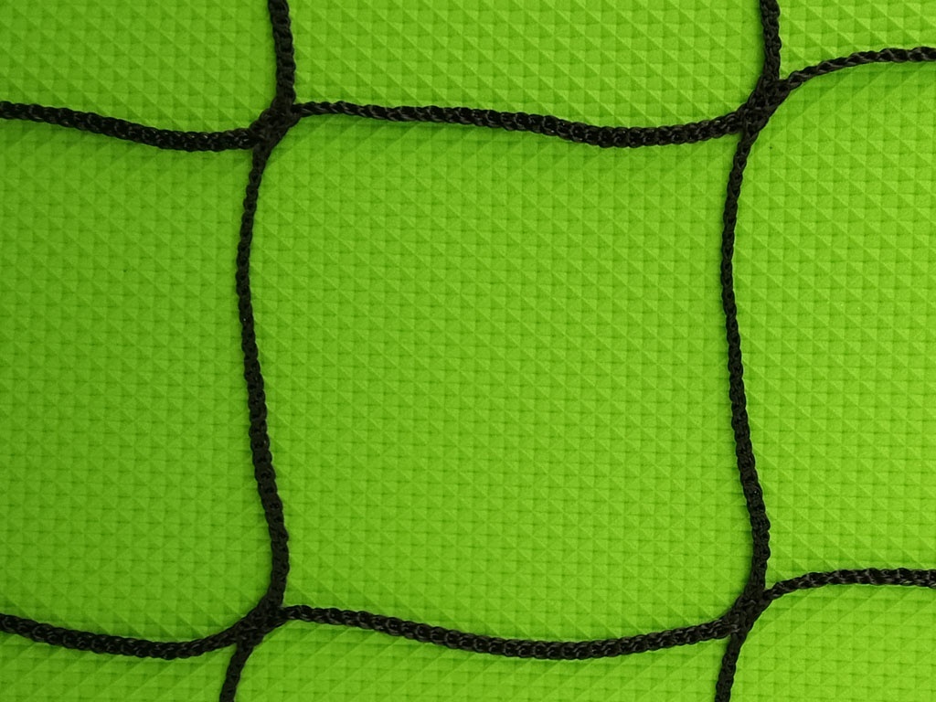 - Форма ячейки — квадратная, размер 9,5х9,5 см: такая конструкция равномерно распределяет нагрузку при ударах мяча, минимизируя риск деформации сетки.