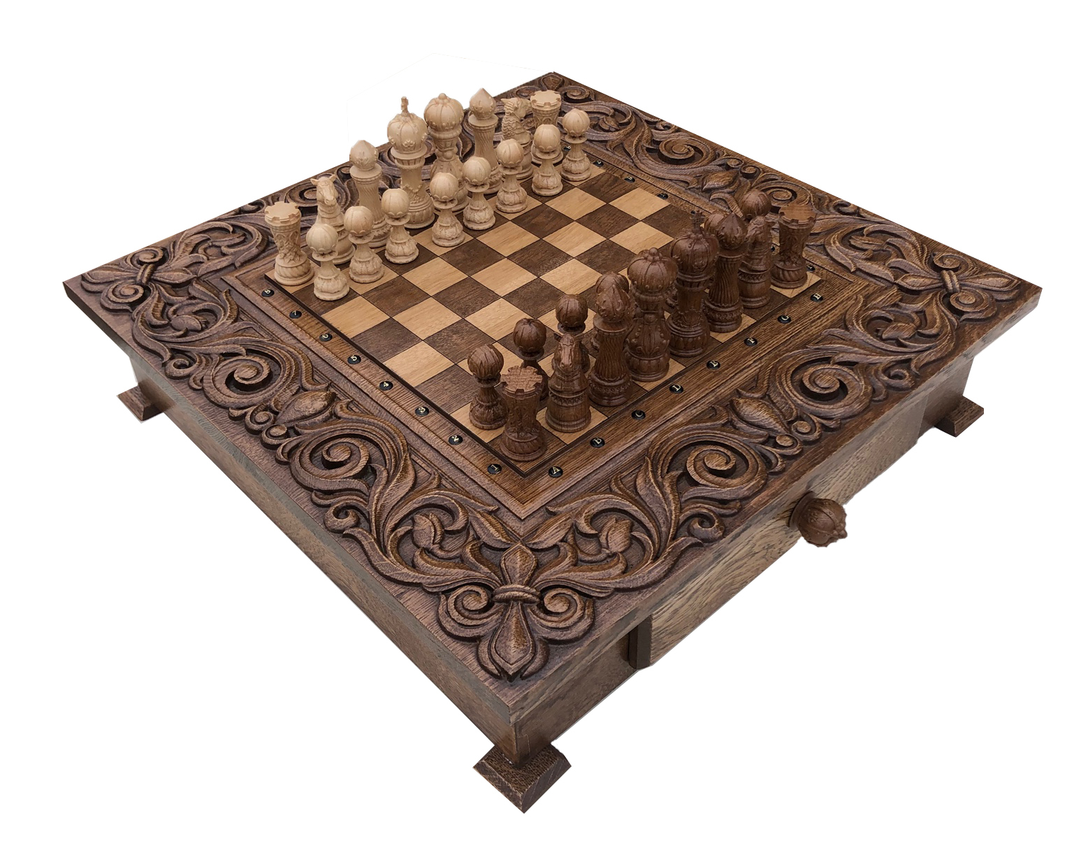 Резные подарочные шахматы в ларце «Имперские», выполненные из натуральной дубовой древесины - по-настоящему королевский набор, впечатляющий своим качеством и красотой. Доска в виде ларца с выдвижными ящичками для хранения в них фигур украшена резными флористическими узорами, выполненными в технике ручной резки.