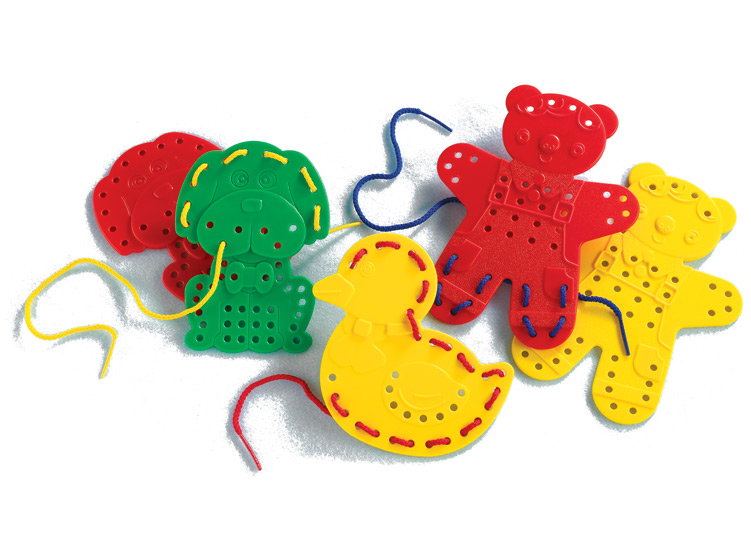 - Раздайте детям фигурки и шнурки и попросите вдеть шнурки во все отверстия, победит тот, кто сделает это быстрее остальных