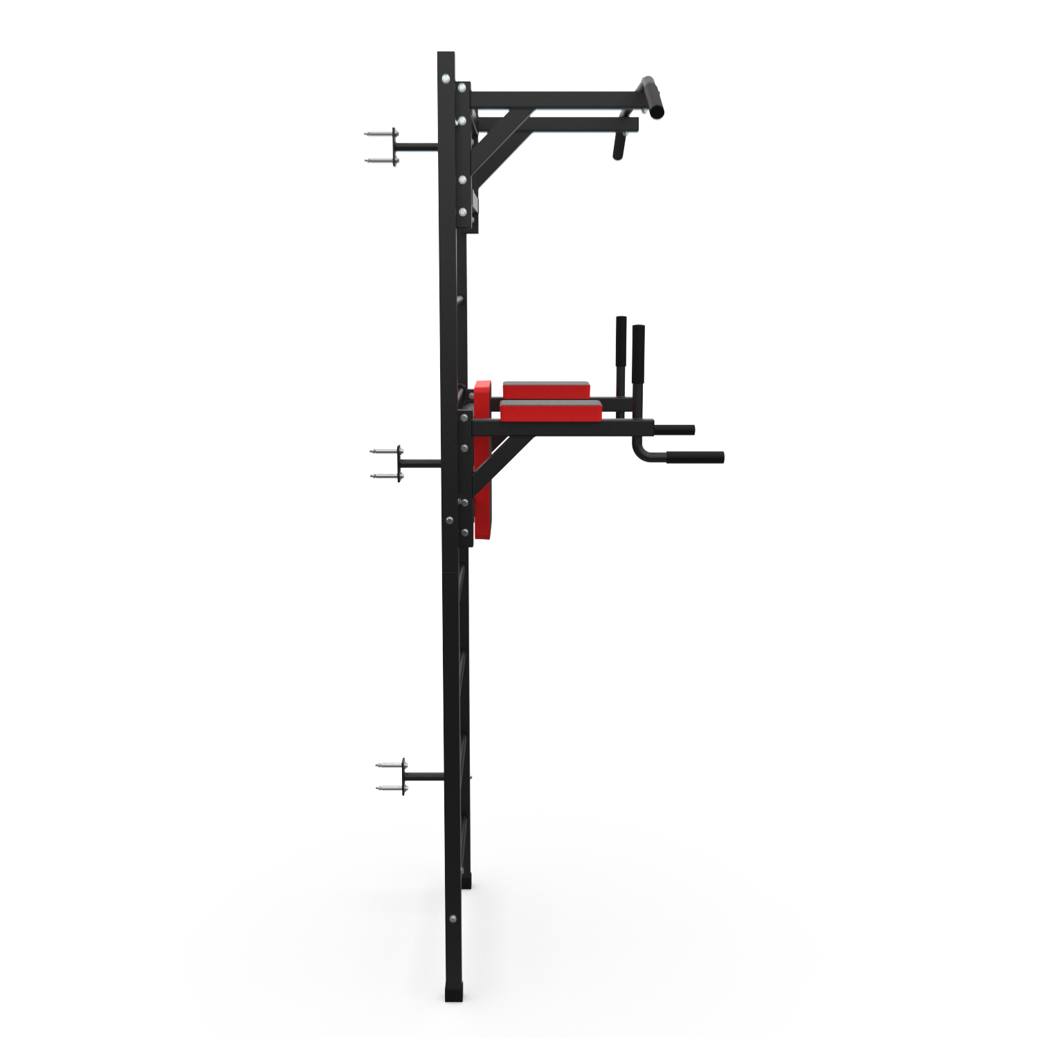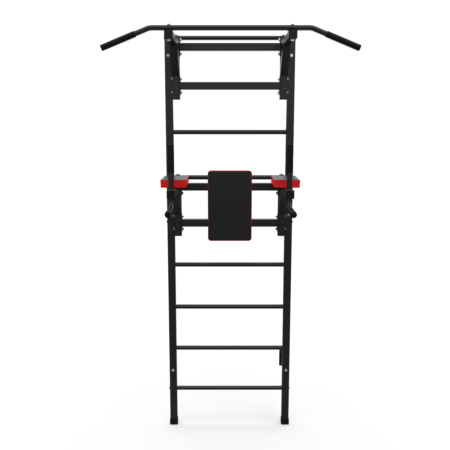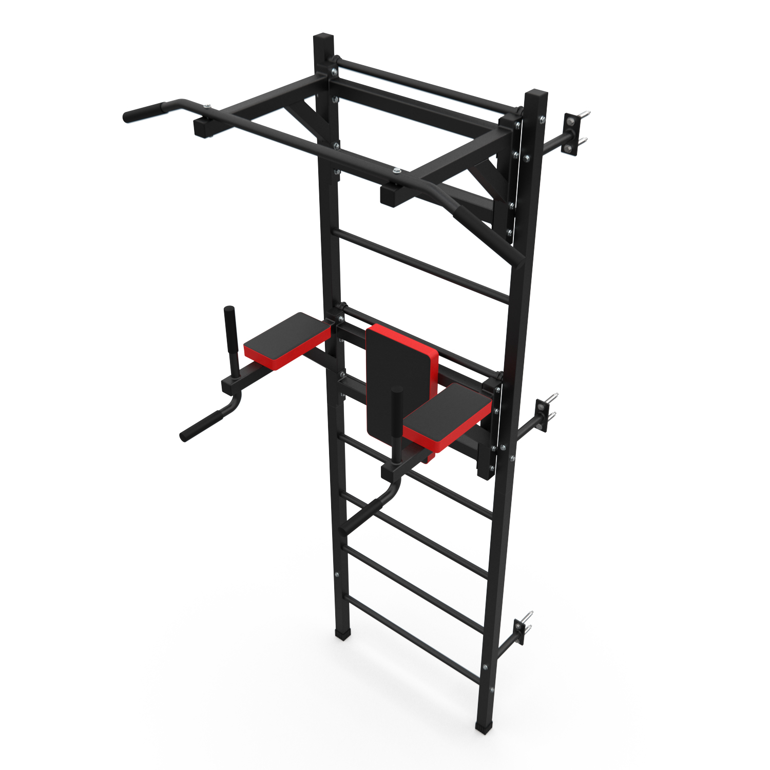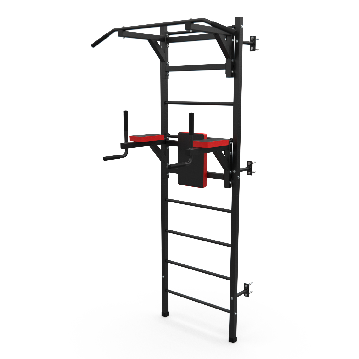 Турник длиной 99 см оснащён мягкими неопреновыми ручками, очень легко перевешивается на перекладины шведской стенки, что позволяет менять его высоту. Расстояние от ручек турника до шведской стенки (вынос турника) - 72 см. Вынос брусьев – 87 см, размер подушки под спину 42 х 25 см, а её толщина 5 см. Подушки подлокотников размерами 25 х 13 х 5 см, а поручни длиной 32 см диаметром 25 мм и толщиной стали 1,5 мм.