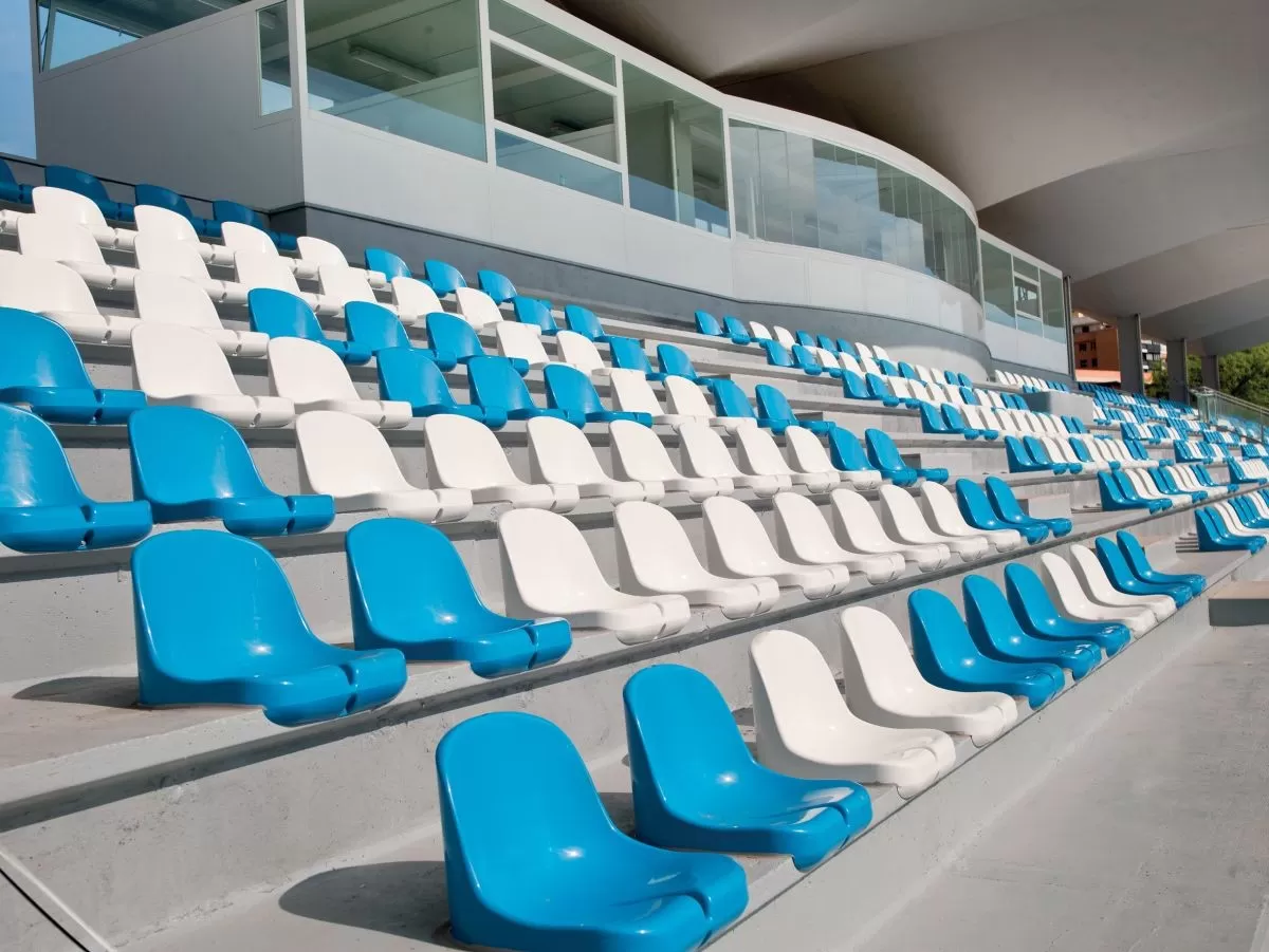 Изготовлены из полипропилена, огнестойкого, ударопрочного, стойко к ультрафиолетовому излучению, в соответствии с DIN 4102B1. Быстрая и простая установка благодаря тройному винтовому соединению. Точки крепления защищены от вандализма. Все сиденья оснащены выходным отверстием для воды. Доступны в цветах: черный, белый, оранжевый, зеленый, синий, желтый, красный, серый. Подходит для внутренних и наружных трибун. По запросу места могут быть пронумерованы.