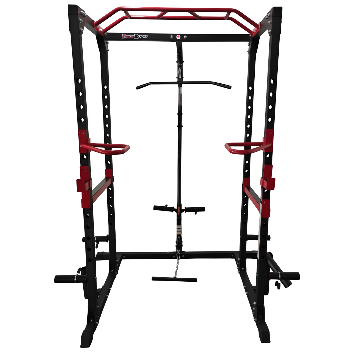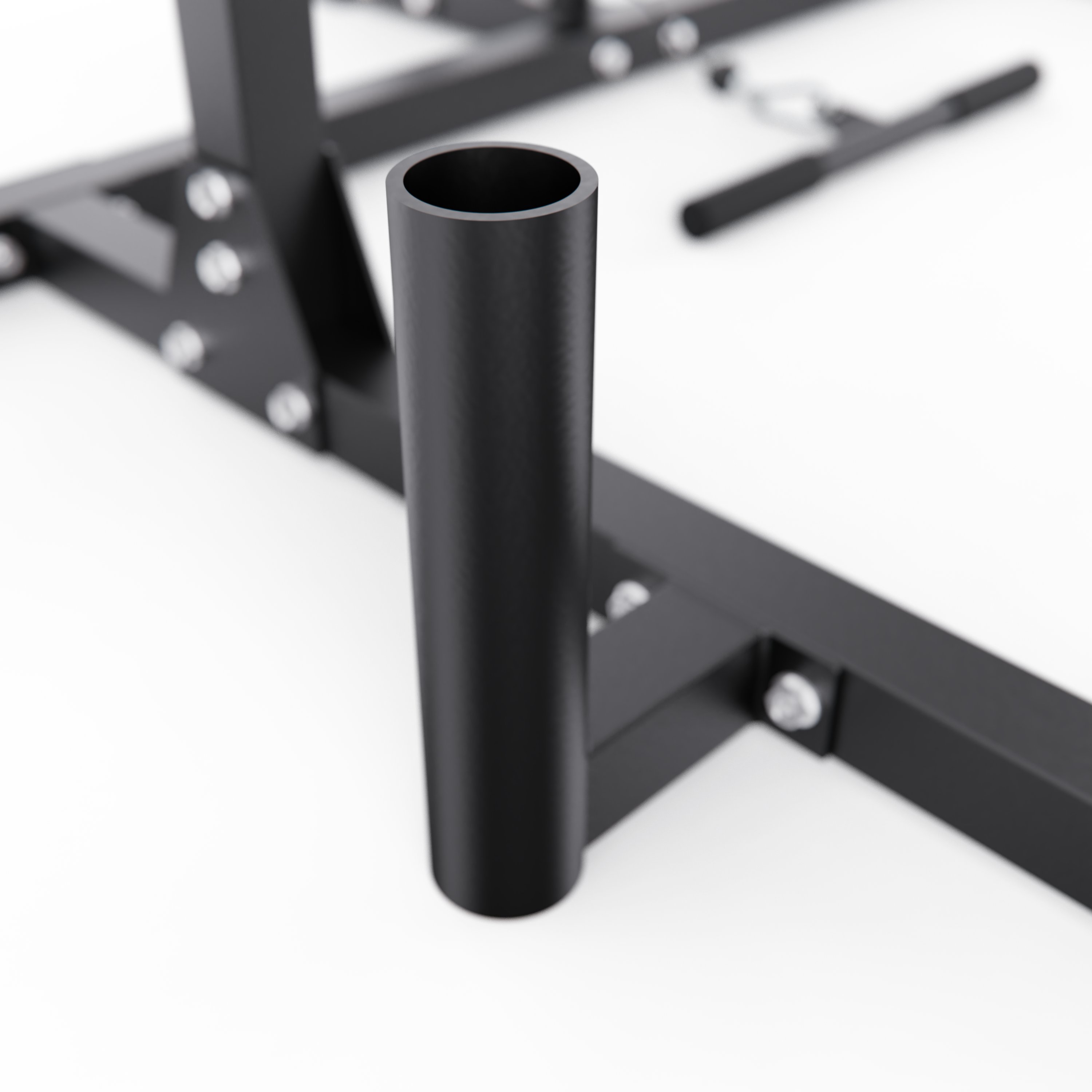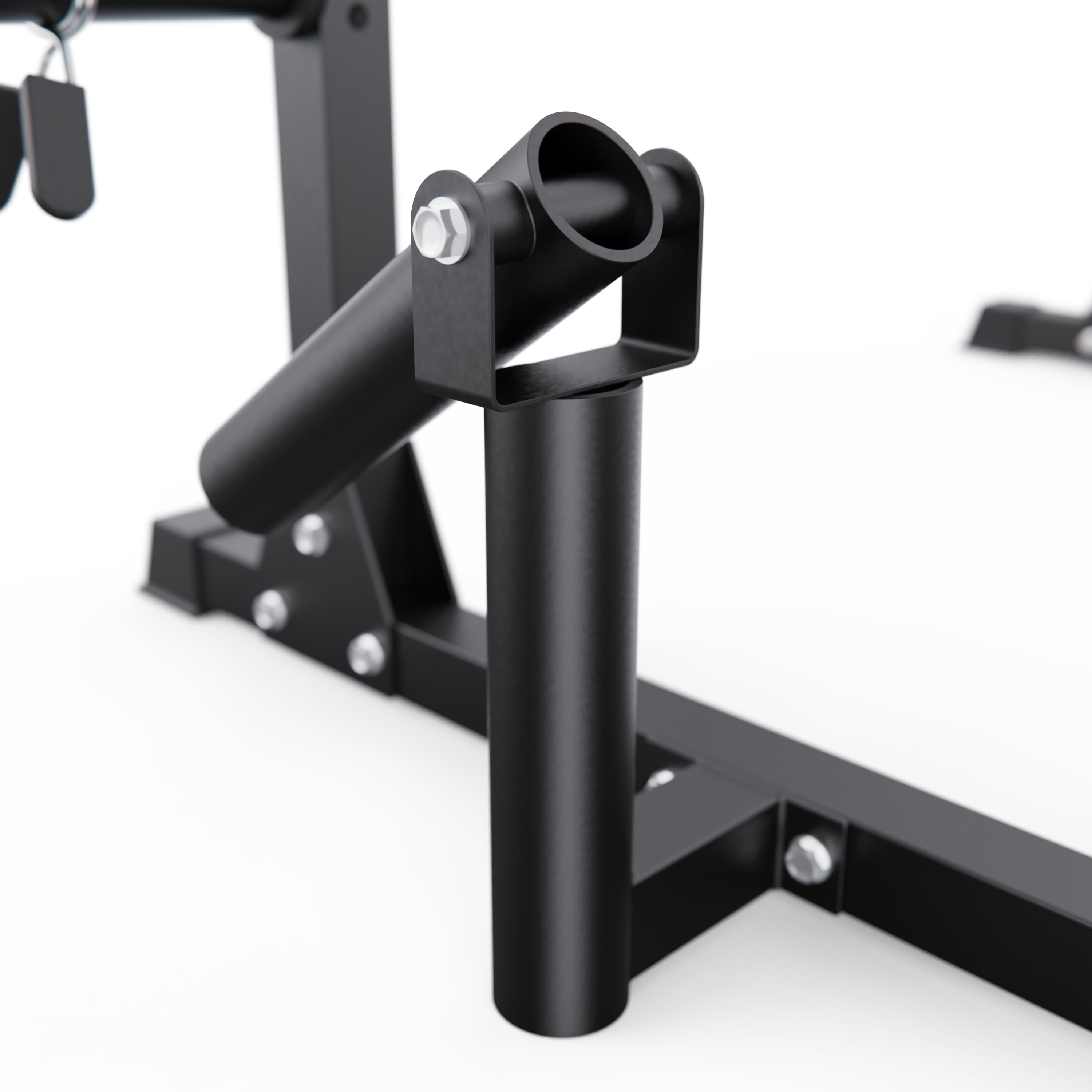 В нижней части рамы предусмотрено отверстие для выполнения жима в стиле лэндмайн, расширяющего возможности тренировок плеч и корпуса. Боковые упоры позволяют выполнять отжимания на брусьях, прорабатывая грудные мышцы, трицепсы и плечи. Многопозиционный турник даёт возможность выполнять различные виды подтягиваний, включая широкий, узкий и обратный хват, делая тренажёр универсальным решением для комплексных силовых тренировок всего тела.
