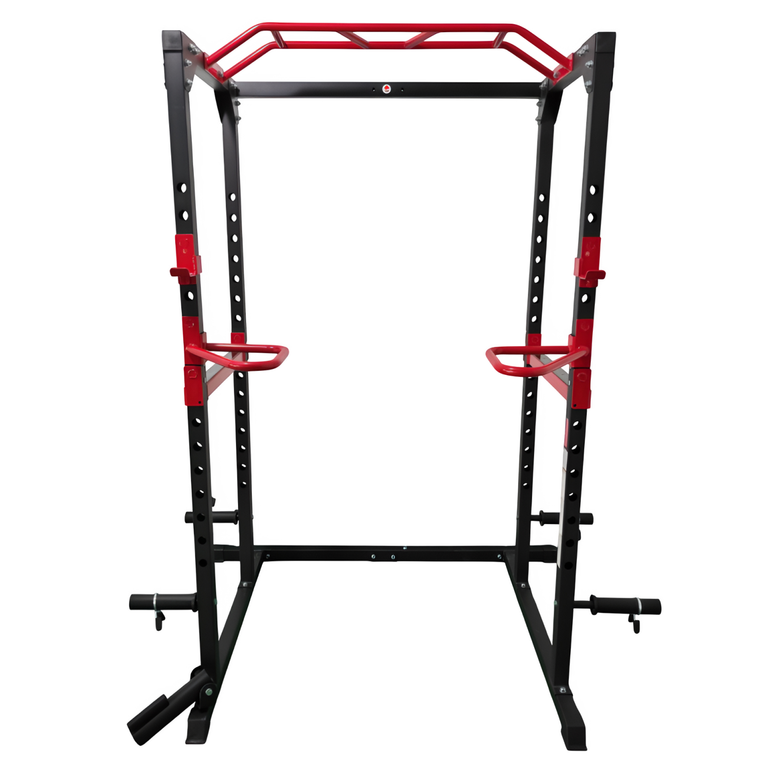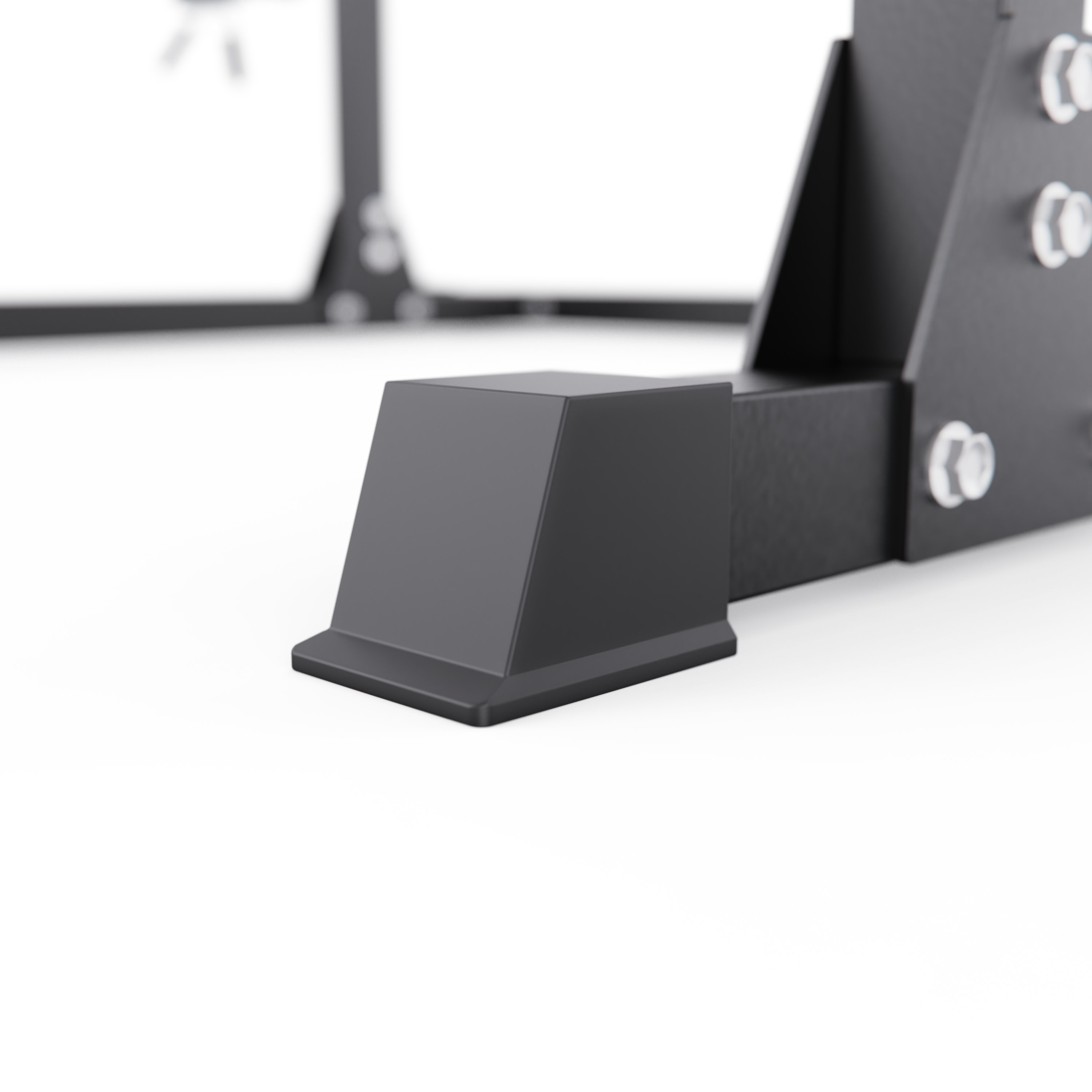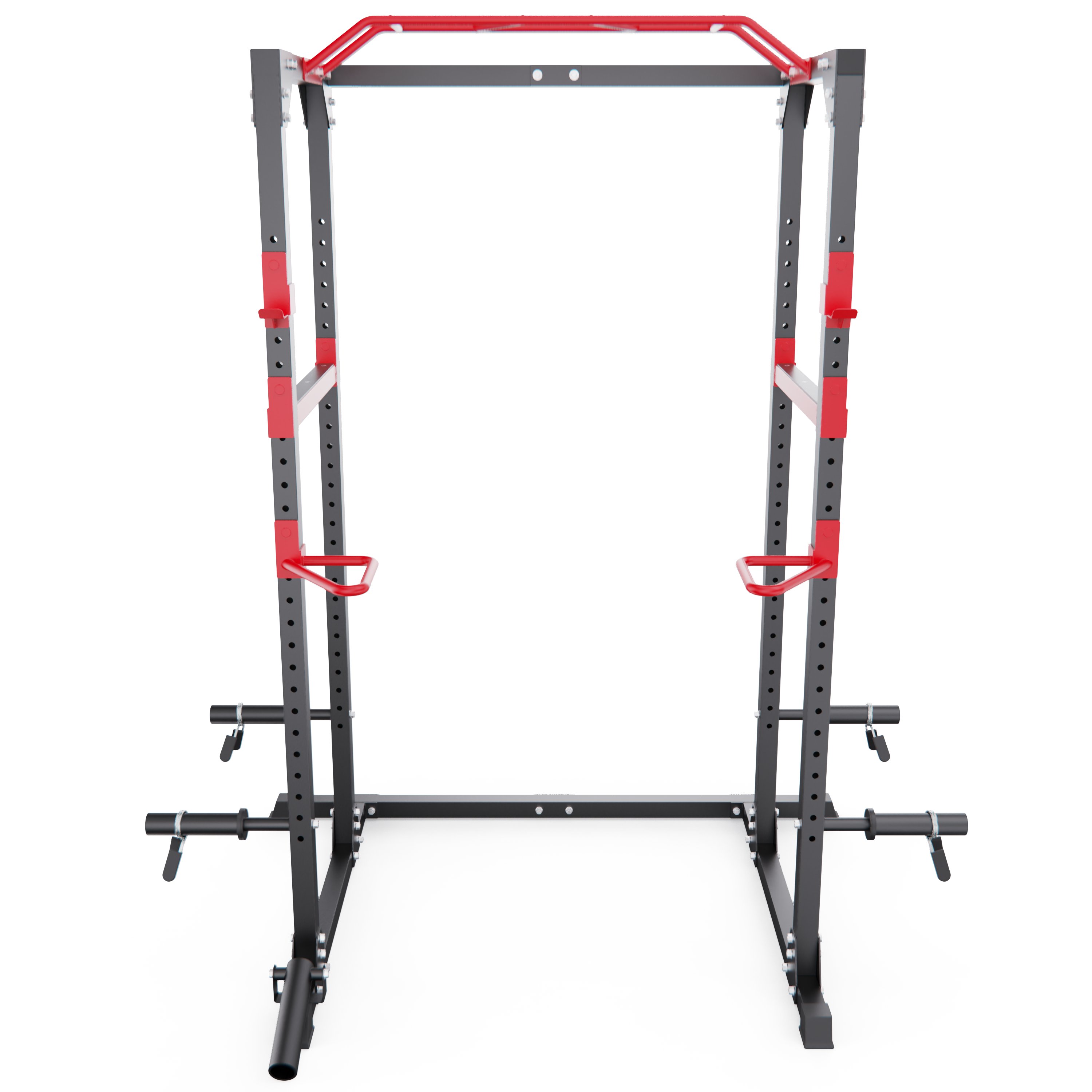 В нижней части рамы предусмотрено отверстие для выполнения жима в стиле лэндмайн, расширяющего возможности тренировок плеч и корпуса. Боковые упоры позволяют выполнять отжимания на брусьях, прорабатывая грудные мышцы, трицепсы и плечи. Многопозиционный турник даёт возможность выполнять различные виды подтягиваний, включая широкий, узкий и обратный хват, делая тренажёр универсальным решением для комплексных силовых тренировок всего тела.