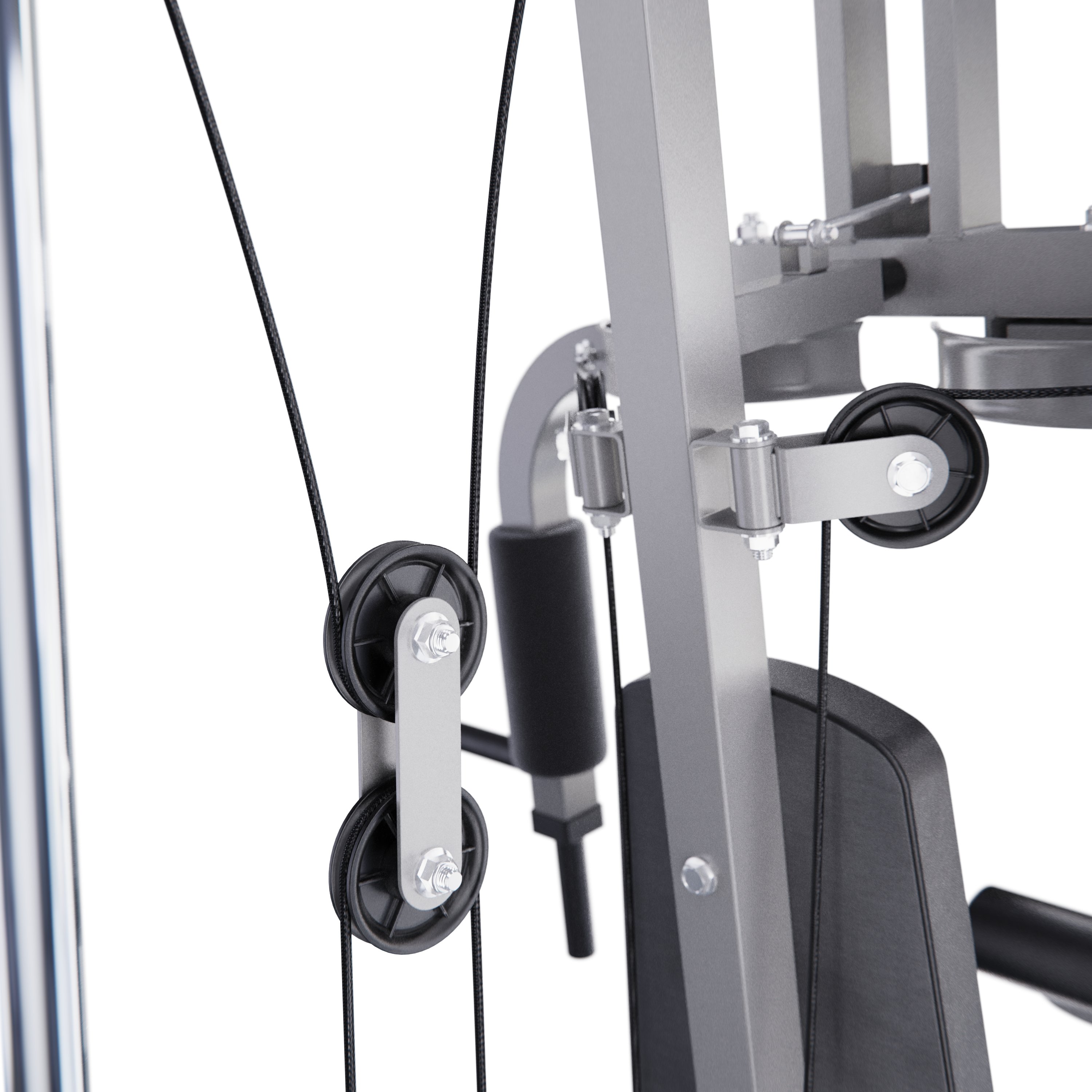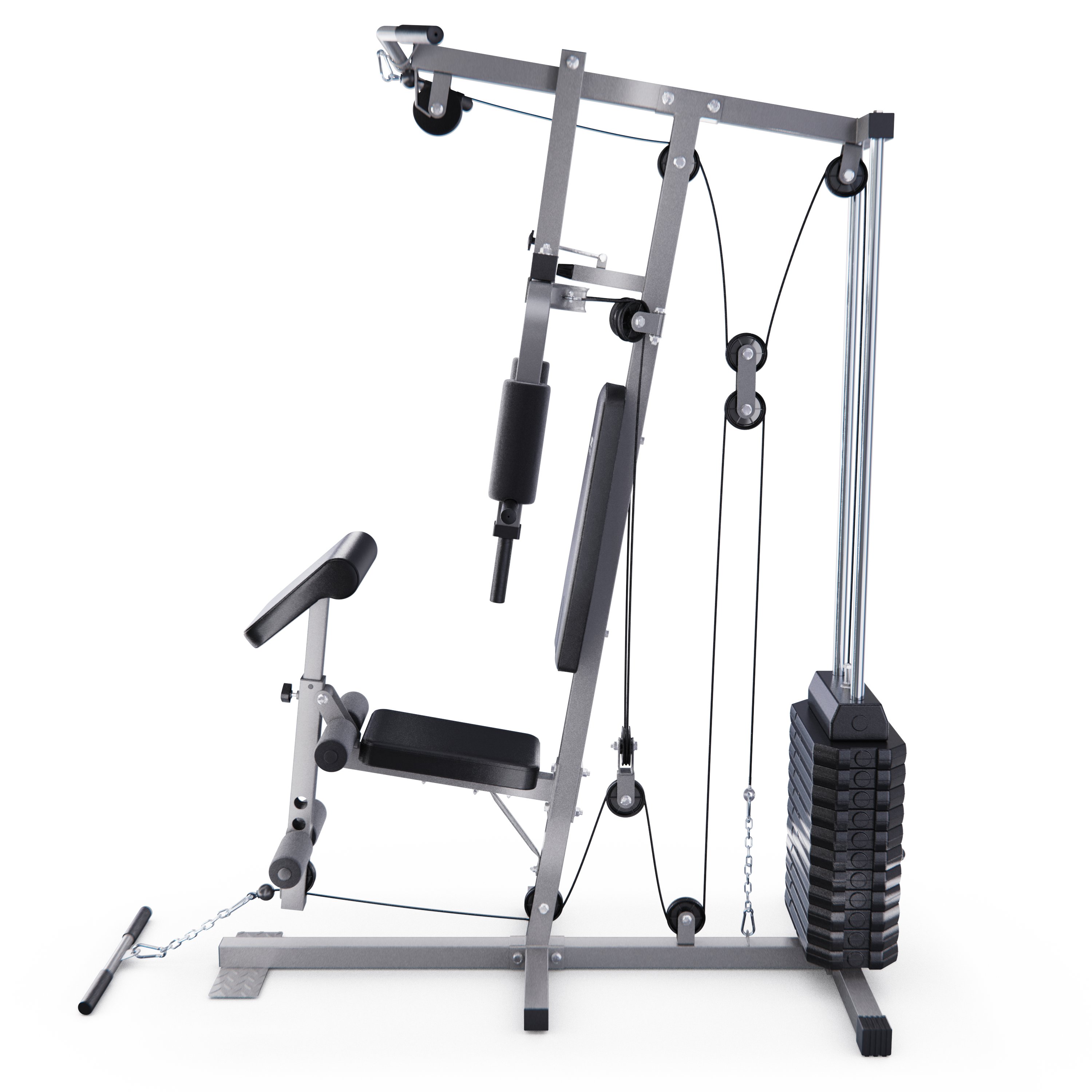 Комплекс не требует дополнительных снарядов - он полностью автономный. В комплект входит весовой стек массой 60 кг: 11 пластин по 4,5 кг и верхняя пластина 5 кг. Ролики на подшипниках обеспечивают плавное движение. Стальной трос толщиной 4 мм в защитной оплетке так же гарантирует безопасность при выполнении упражнений.